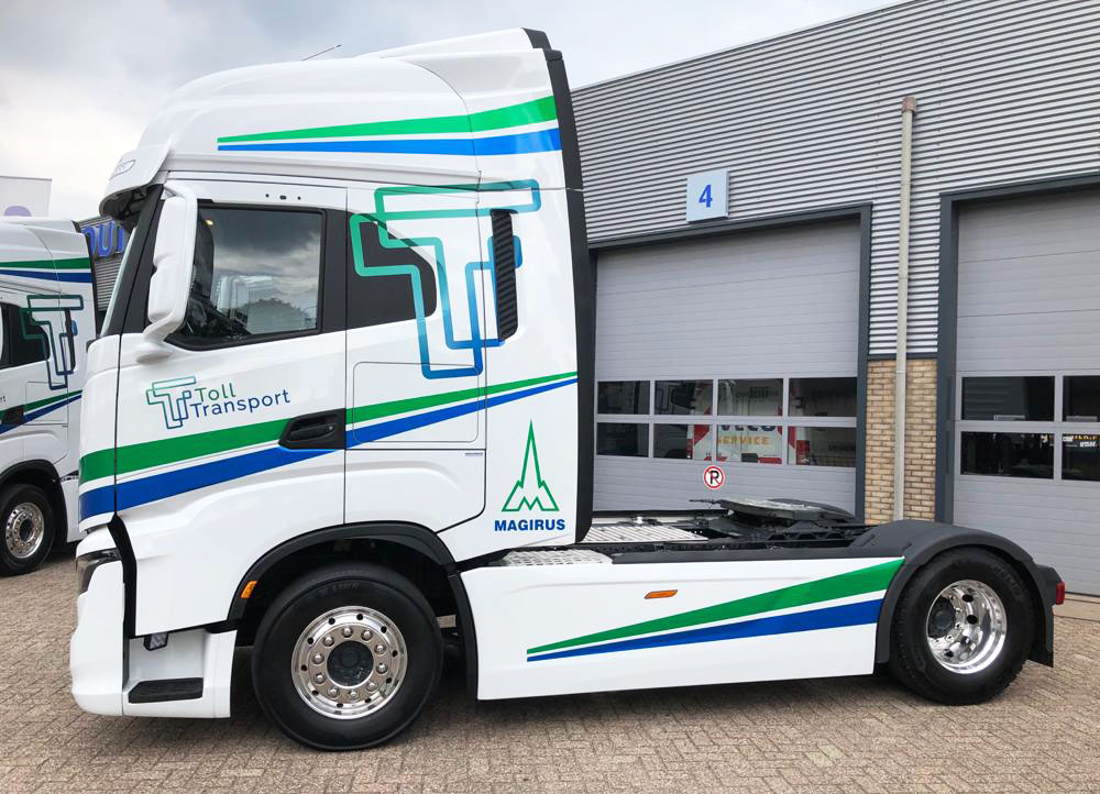 De nieuwe trucks zijn gehuld in de huisstijl van Toll Transport, waarbij oog is geweest voor details. Zo is metallic verwerkt in de kleuren en pronkt het Magirus logo op de zijkanten van één van de trucks. Hiermee accentueert Toll Transport haar relatie met Magirus-Deutz. Zo heeft vader Jan twaalf S3500 bussen gehad, waar hij dol op was. Ook pronkt er een Magirus logo op de achterzijde van de cabine. Sjors voegt hieraan toe: “De bestickering is verzorgd door Goedsign. We zijn zeer te spreken over de kwaliteit die zij hebben geleverd. De vrachtwagens zien er fantastisch uit!” Door de komst van de nieuwe trucks zet Toll Transport haar ambitie kracht bij om uiteindelijk door te groeien naar een wagenpark met 20 trucks.