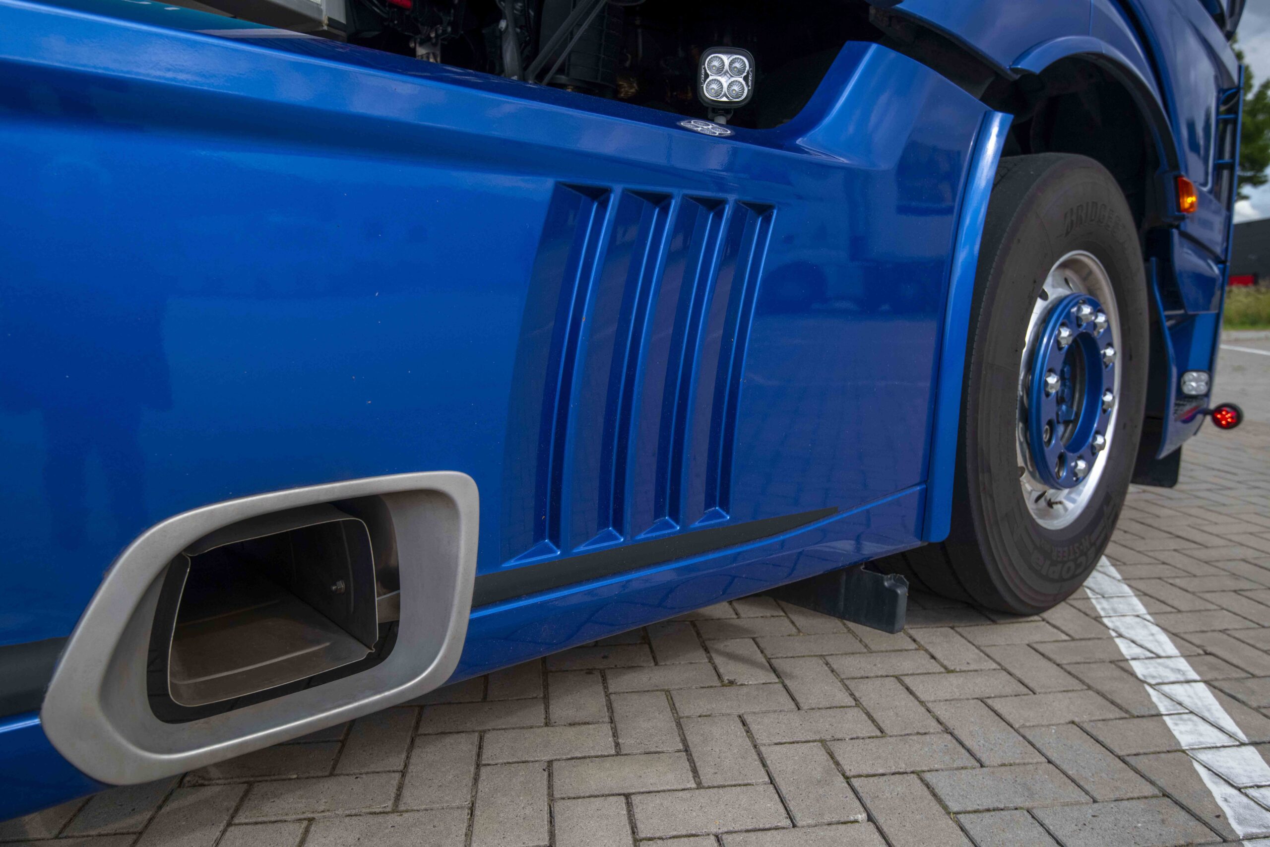 De chauffeurs van Arja Trans mogen op eigen initiatief en kosten ‘hun’ truck verder aankleden naar eigen voorkeuren en inzichten. Ook Niels Otten heeft ruimschoots gebruikgemaakt van deze mogelijkheid. Hij vertelt: “Ik heb het blauwe thema wat doorgevoerd. Zo ligt er in het interieur geen standaard bodembekleding, maar een kunststof vloermat, uitgevoerd in blauw. Verder heb ik blauwe gordijnen laten aanbrengen en de deuren – net als de stoelen – laten bekleden met leder. Bovenop de cabine is er een lichtbakje geplaatst met schijnwerpers ernaast. Al met al staat er een geslaagde, smaakvolle truck die – zeker qua kleur – goed past bij het wagenpark van Arja Trans. Onderweg krijg ik er veel complimenten over, vooral van andere truckers. En nu ben ik ook nog gevraagd de truck tijdens de feestweek hier in het dorp naast een oude Benz neer te zetten. Een mooi compliment vind ik dat!”
