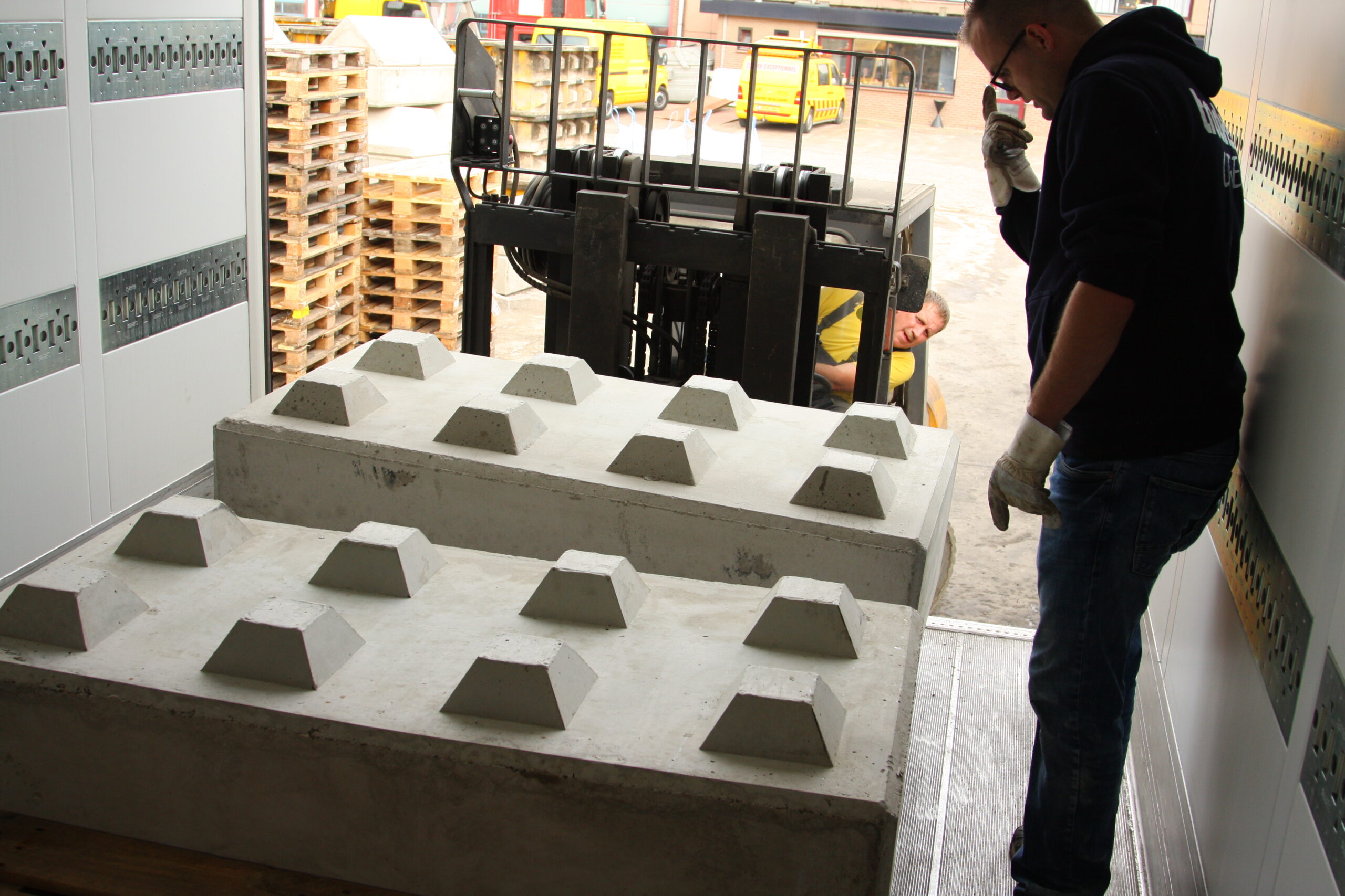 Vink-medewerker Henk Boon plaatst het laatste legoblok beton (op een europallet) in één van de opleggers.