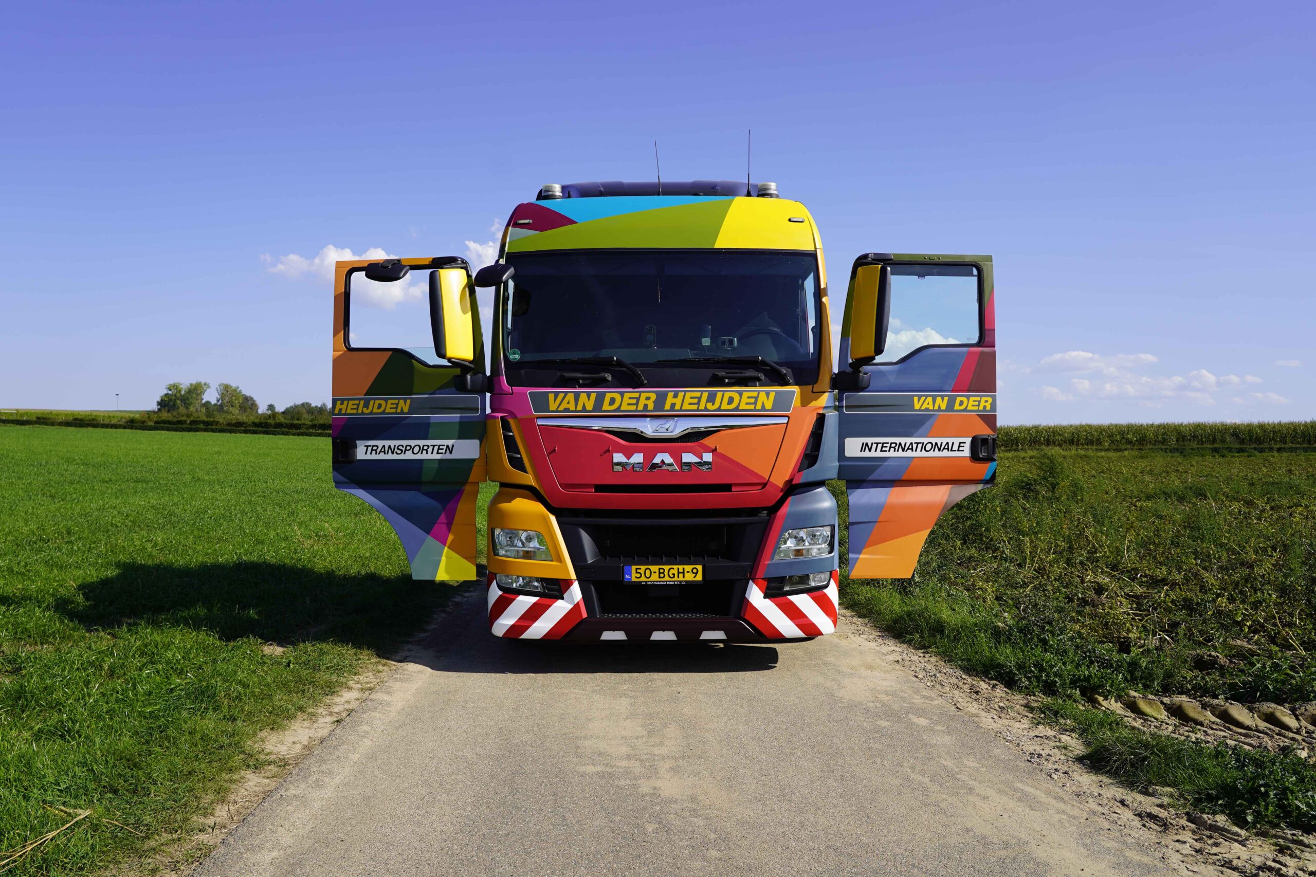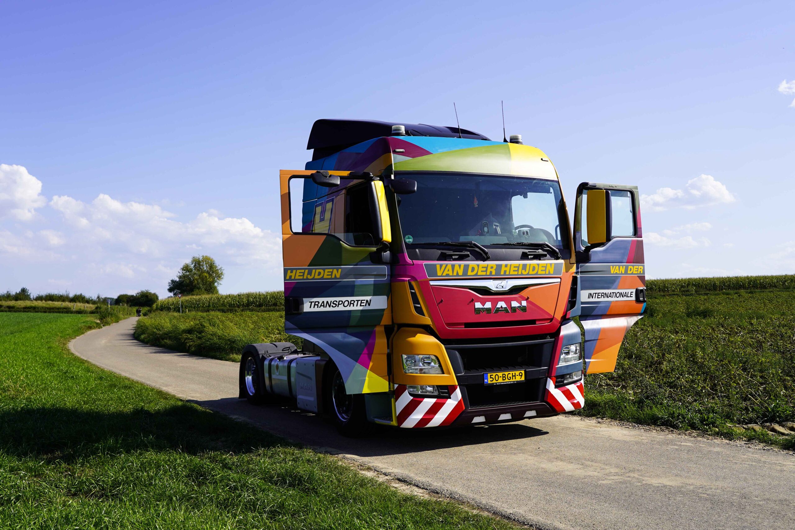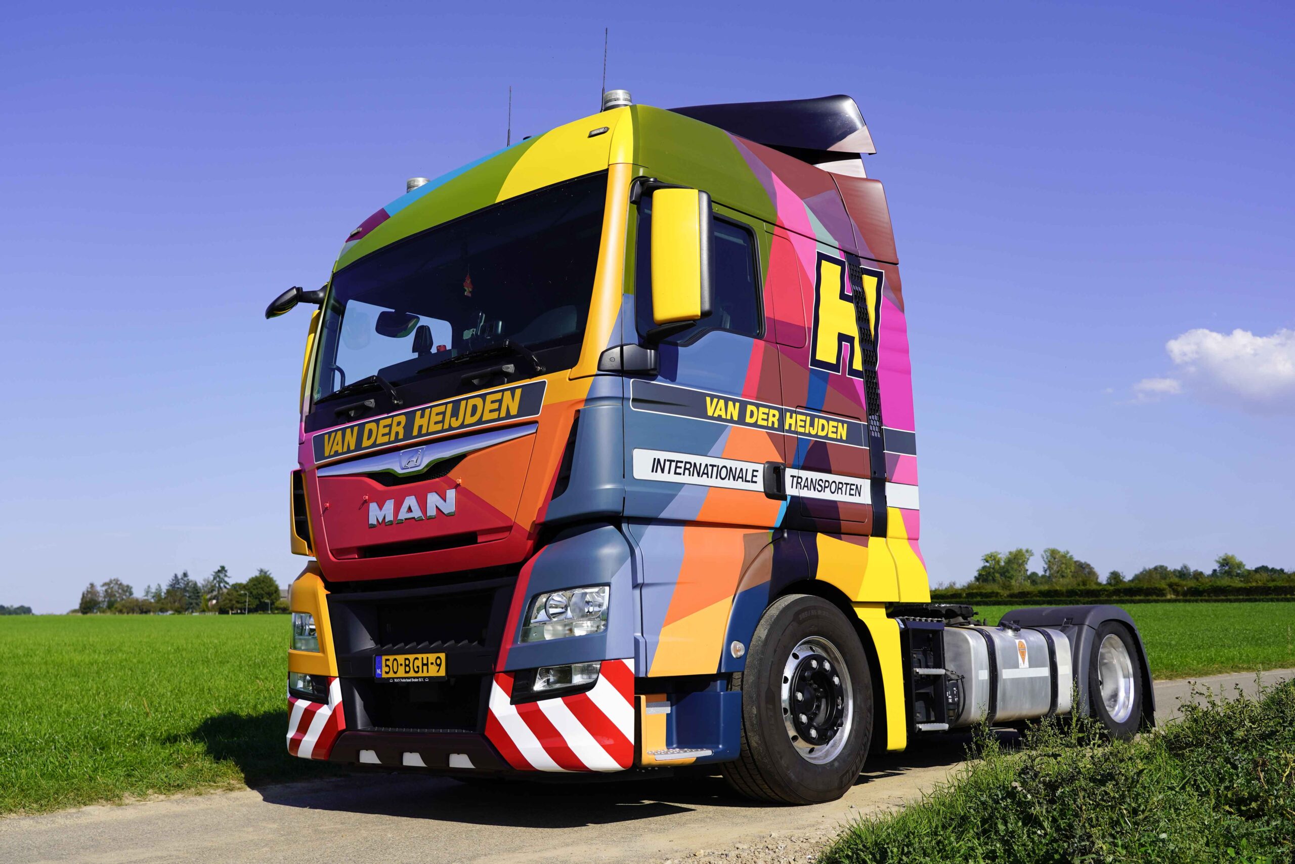 Het eindresultaat? Een fraaie truck met kleurrijke en geometrische vormen. De acryllaag is met 3 lagen vernis afgewerkt waardoor het rijdend kunstwerk zijn mannetje zal staan in alle weersomstandigheden en kilometers die met de truck gemaakt zullen worden. Het rijdend kunstwerk zal zijn internationale routes vervolgen in deze nieuwe verschijning. Van der Heijden is specialist op Zwitserland.