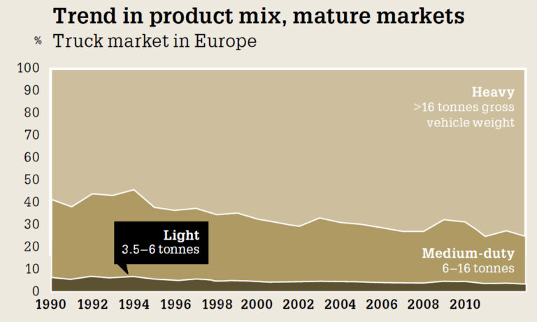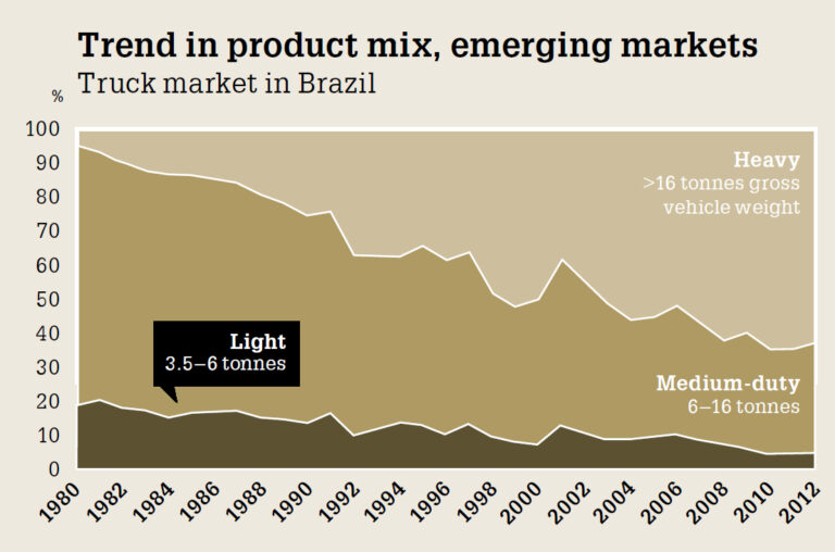 Zo is in Brazilië het lichtere transport sterk terrein aan het verliezen ten opzichte van het zwaardere transport. Waar lichte en middelzware trucks in 1992 nog 65 procent marktaandeel hadden blijkt dat in 2012 gedaald te zijn tot veertig procent.