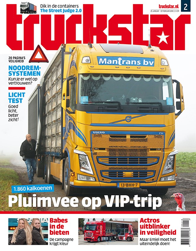 Verder steken we ons licht op bij de lichttest en ervaren we tijdens een rit met de nieuwste Mercedes Actros van Ambrosius al die veiligheidssnufjes in de praktijk. In de praktijktest voelen we de Mercedes Antos aan de tand. Maar je vindt in dit nummer uiteraard ook een aantal ritverslagen. Zo rijden we 1.860 kalkoenen als VIPs naar Duitsland, doen we een dagje bietencampagne met de babes van Benedictus en gaan we met Van Boxtel met chalets naar Ameland. Ook brengen we een bezoek aan Jan-Willem van Appeldoorn: trotse bezitter van maar liefst drie Volvo’s. Dit en nog veel meer lees je in de nieuwste Truckstar.