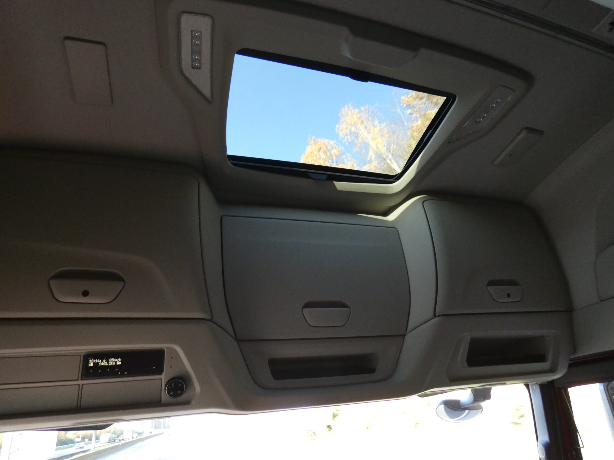 - Grote kasten boven de voorruit bieden veel opbergruimte. Het dakraam zorgt voor licht.