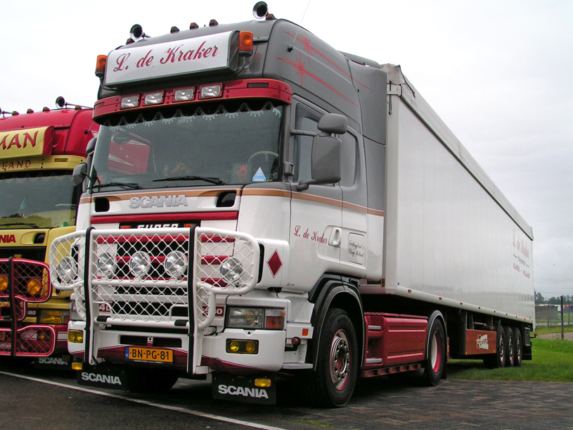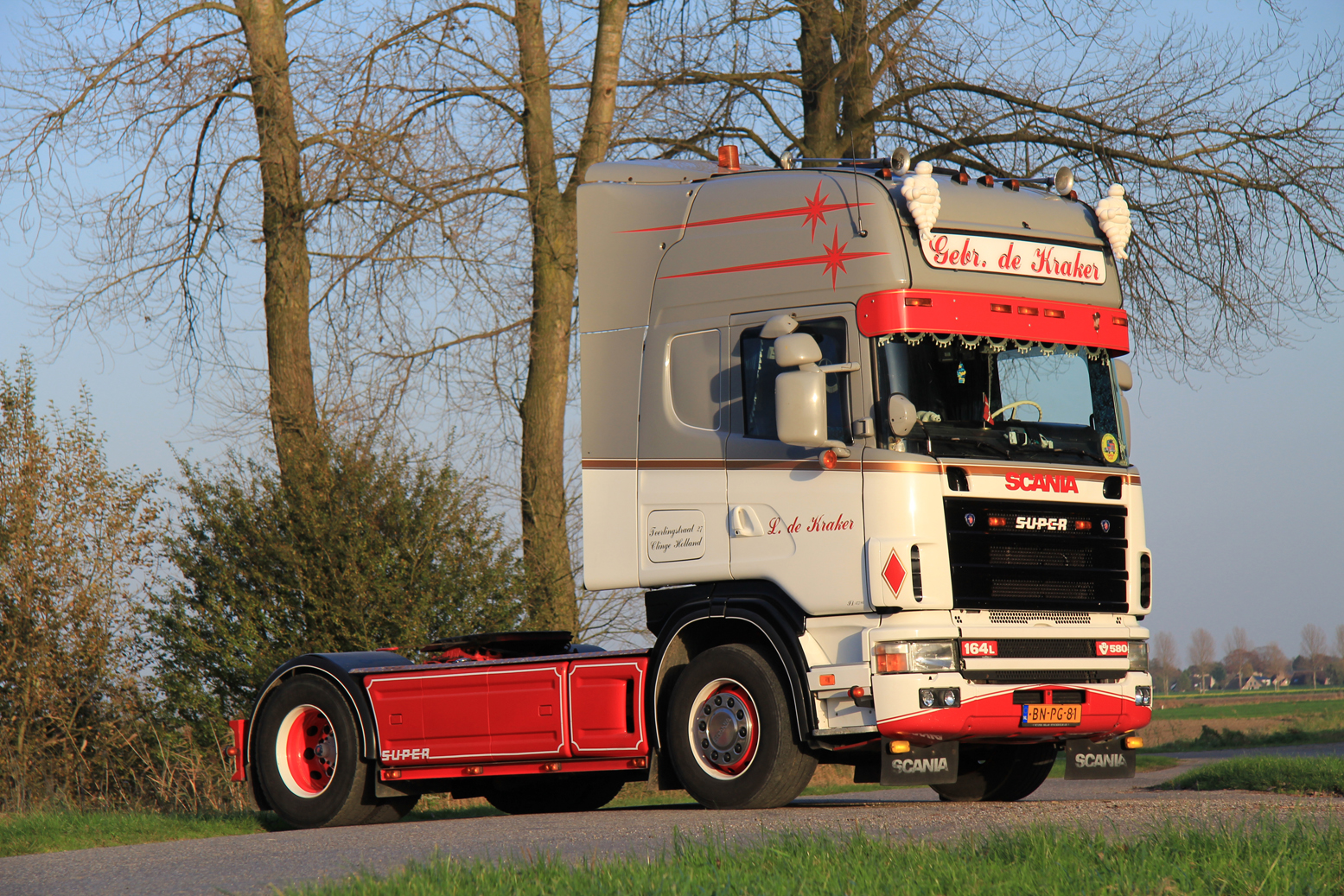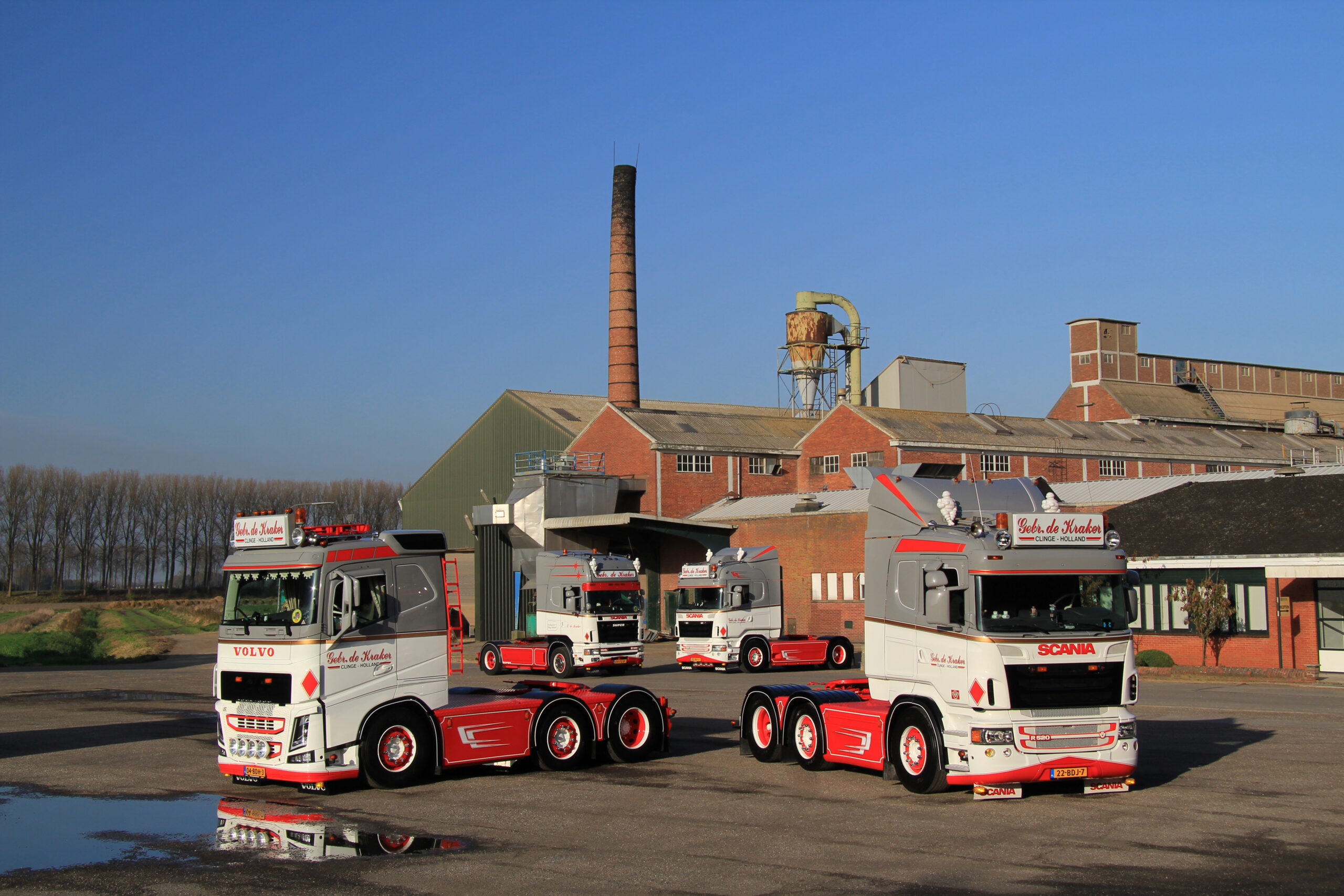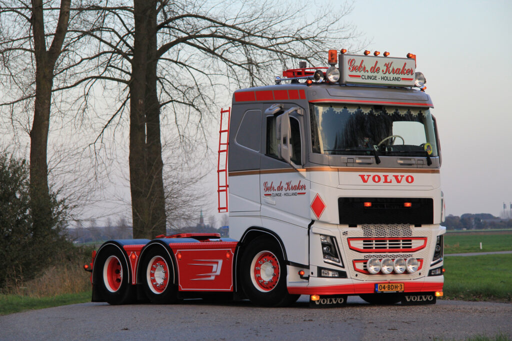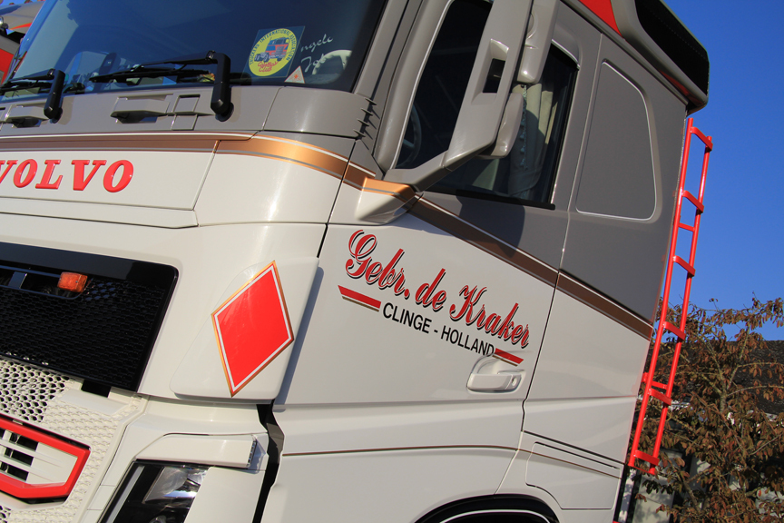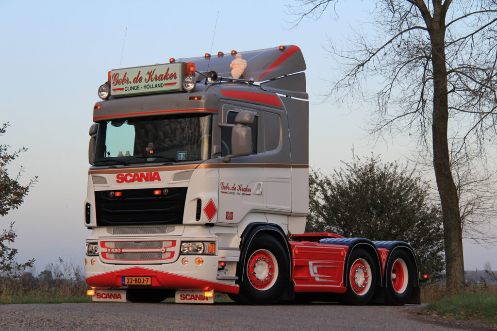 Het eerste weekend van november is niet ideaal om te fotograferen. Toch valt het alleszins mee als ik in Clinge kom voor mijn afspraak met de gebroeders De Kraker. Ik wil hun wagenpark, bestaande uit drie Scania’s en een Volvo, vastleggen voor Truckstar. Naast het huis op het afgesproken adres is het een wirwar van tuinslangen, poetsdoeken en ander gerei waarmee je wagens in topconditie kunt brengen. Het is nog even wachten op de oudste broer, Lorenzo. Angelo, de middelste: “Hij is hier in de buurt op pad met een bandlosser. We maken een hoop tijd vrij voor shows en het bijhouden van de wagens, maar het werk gaat natuurlijk voor. Zelfs als er iemand van Truckstar langskomt.”
