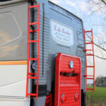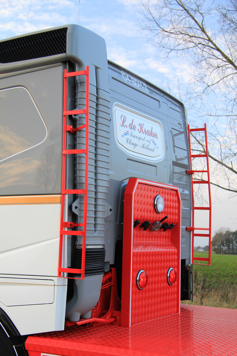 - Zelfgemaakte trapjes en slangenrek achterop de Volvo-cabine.