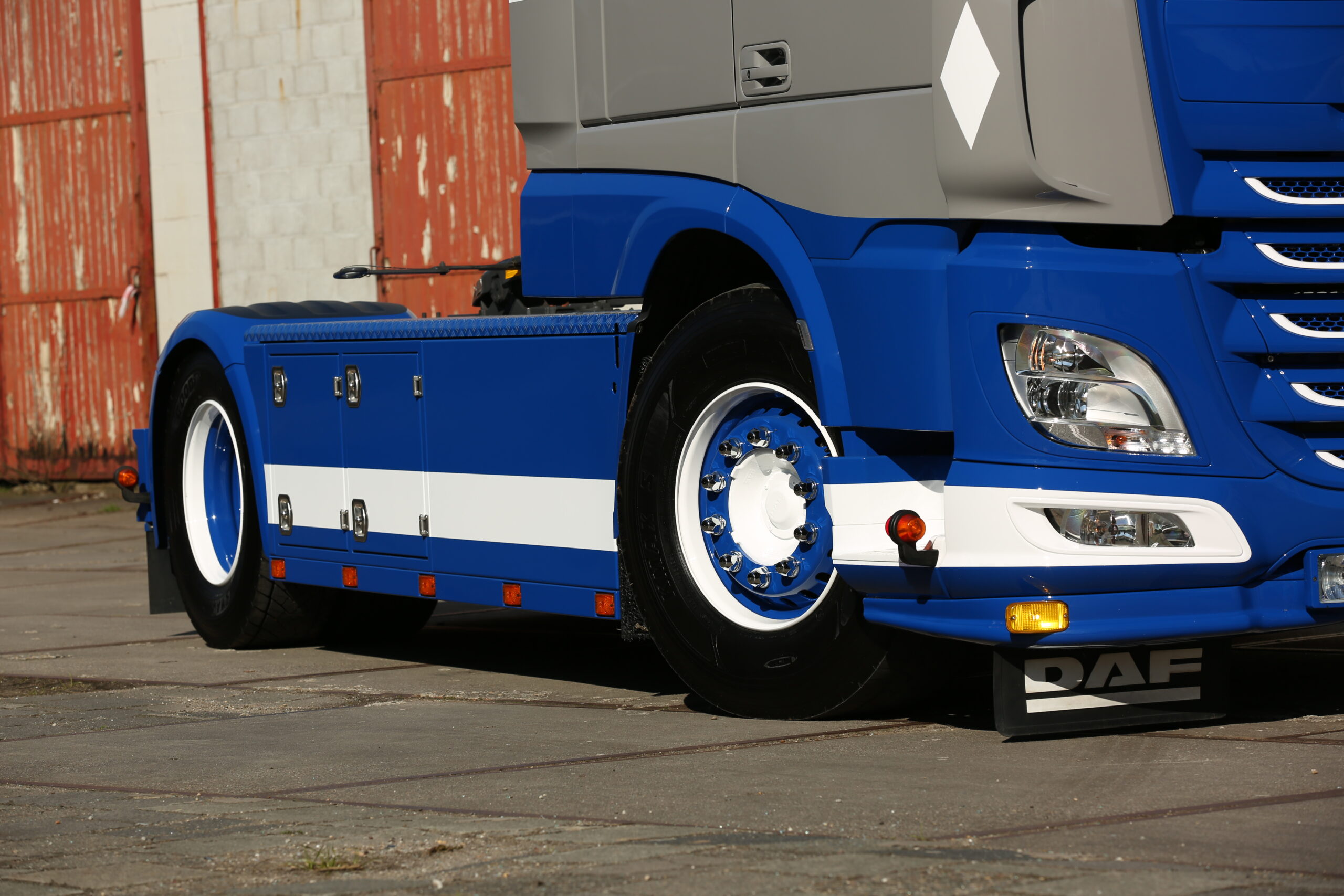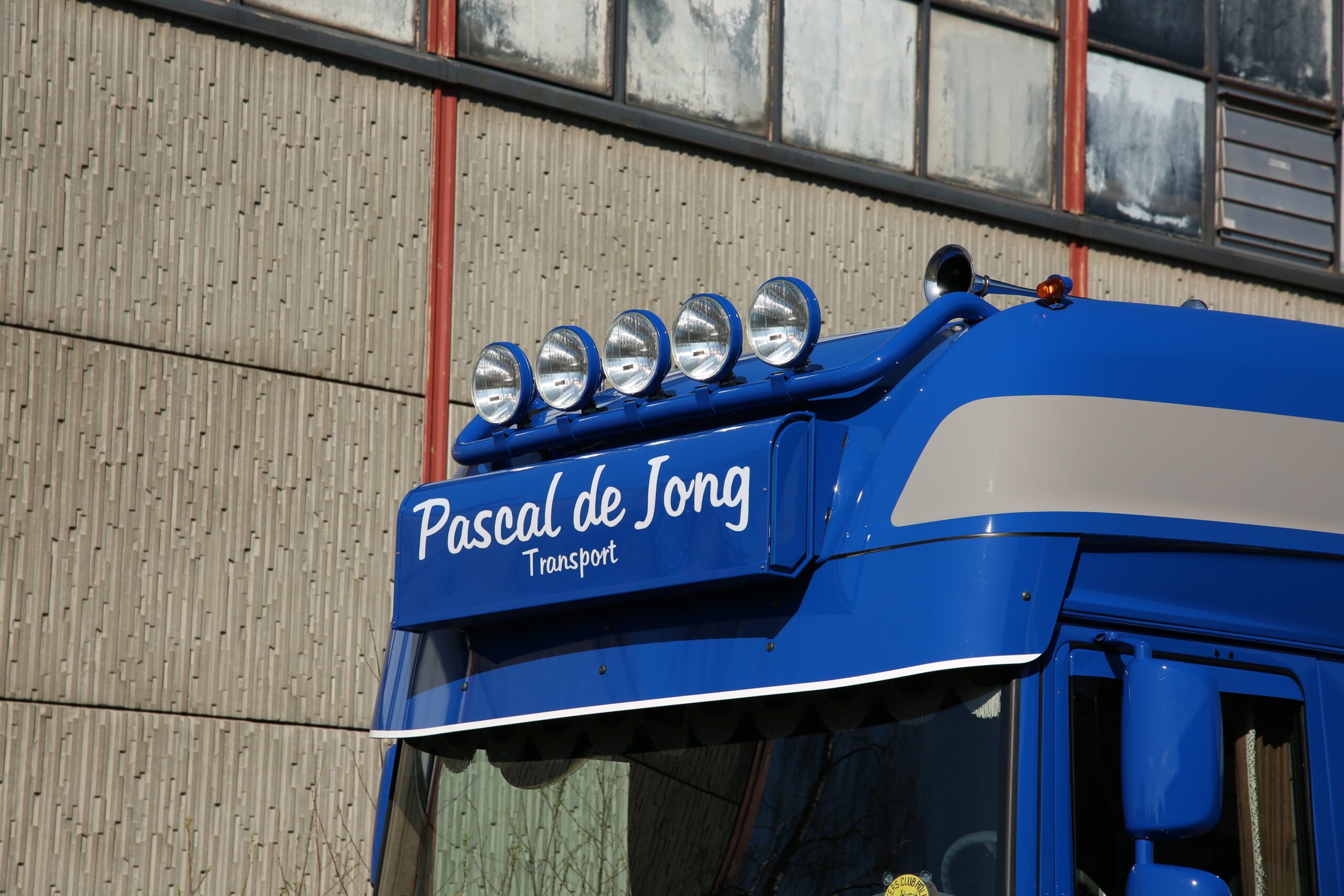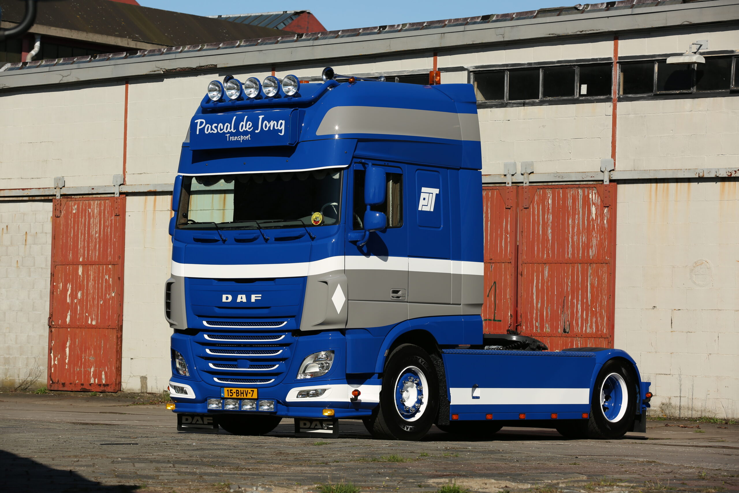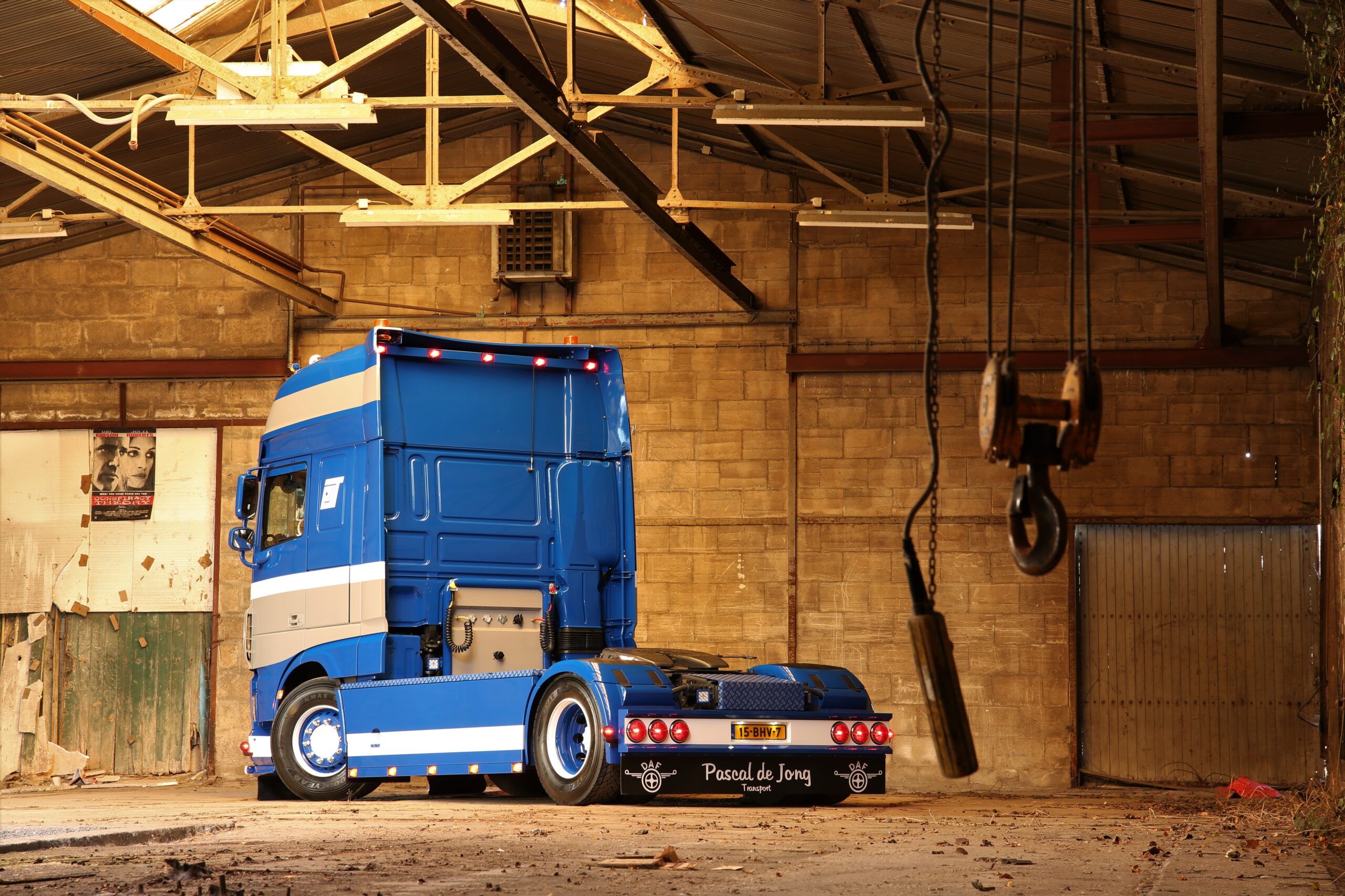Toen vaststond dat het een DAF zou worden, moest Pascal de Jong nadenken over de opbouw en de kleuren. Blauw met een grijs vlak had zijn voorkeur. Met dat uitgangspunt heeft William de Zeeuw van WZ Creations een aantal tekeningen gemaakt, waar Pascal er één van uitkoos. Het resultaat staat voor ons. Vol trots vertelt hij over de opbouw van de DAF: “De witte trekker heb ik opgehaald en thuis in de schuur gezet. Daar ben ik begonnen met het opbouwen van de lampen. In plaats van skylights wilde ik kleine lampjes in het dak. De spuiter heeft de boel passend gemaakt. Op het dak moesten een beugel komen met vijf lampen en een lichtbak. En onder de standaard bumper is een lip met vier lampen aangebracht.”