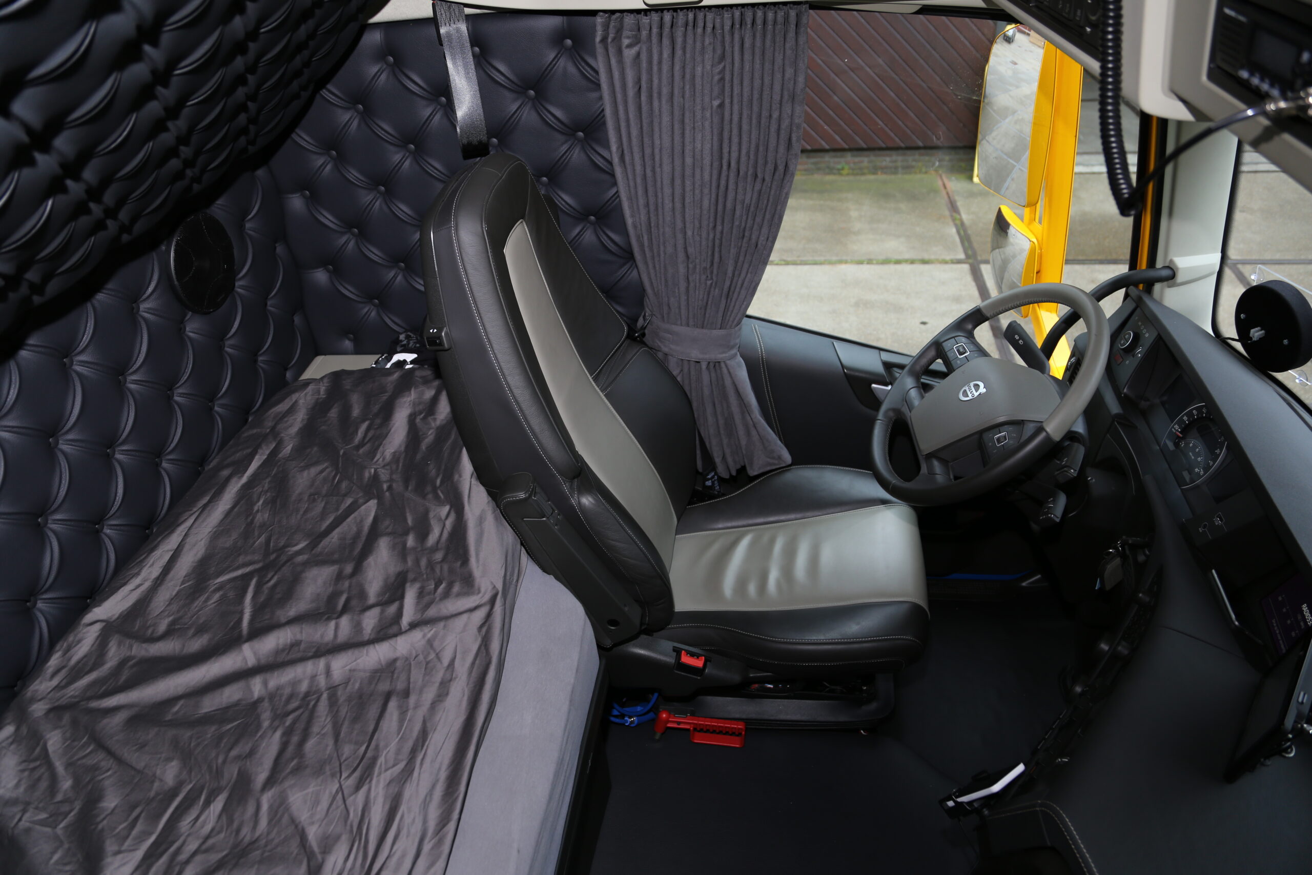 We zijn bij Baarn de A1 opgedraaid en vervolgen via knooppunt Eemnes onze weg naar het zuiden. Mike is al even trots op het interieur van de cabine waarin hij zelf ook niets aan het toeval heeft overgelaten. ,,Ik wilde alles rustig houden. Daarom donker noppenleer en een stijlvolle afwerking van het dashboard.’’ Het geheel brengt inderdaad rust en dat past goed bij de auto. Die ligt met zijn starre voorloper stevig op de weg en het is stil in de cabine.