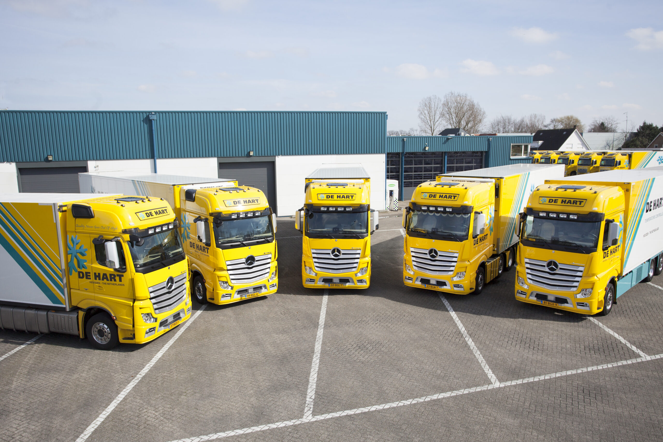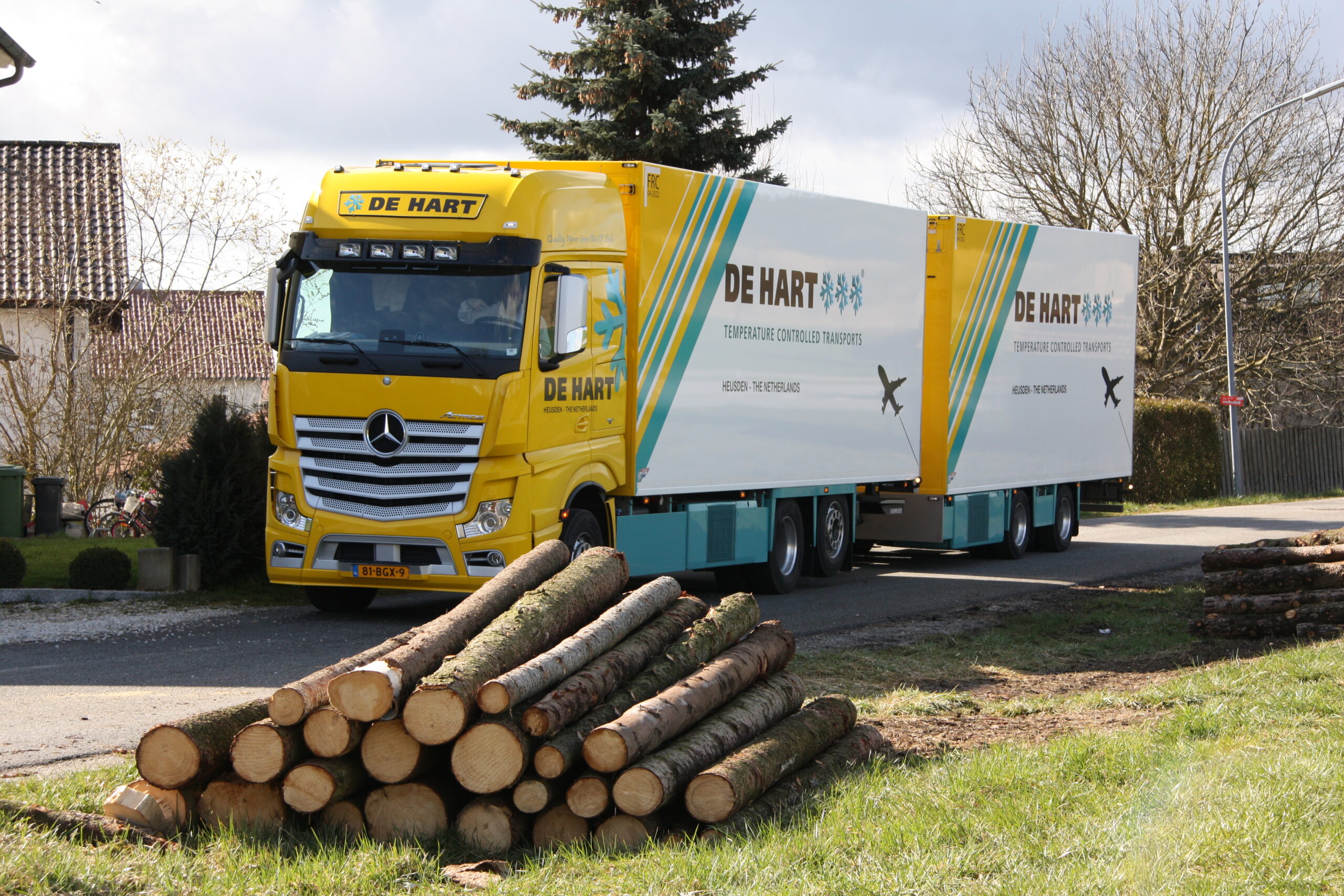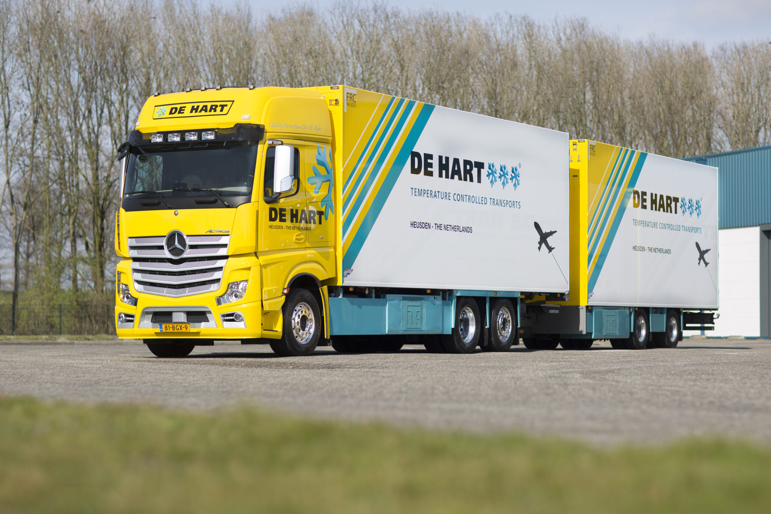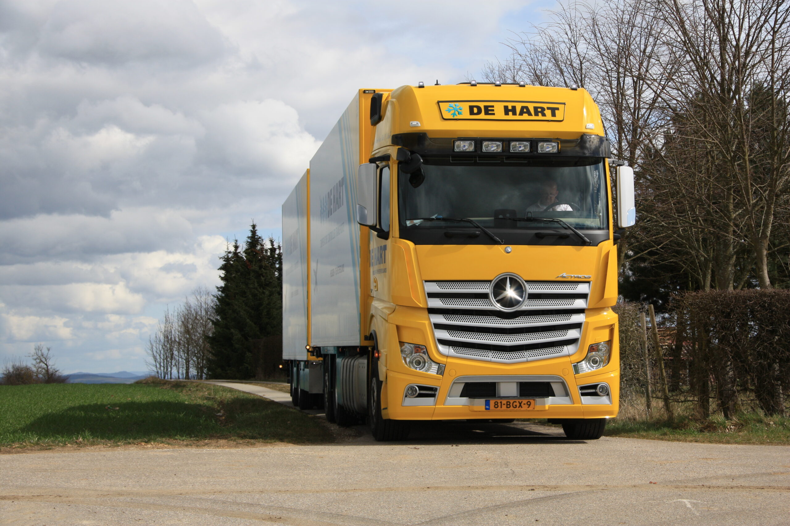 Bijzonder strakke verschijning, de Actros in huisstijl van De Hart Transport.