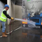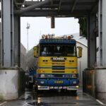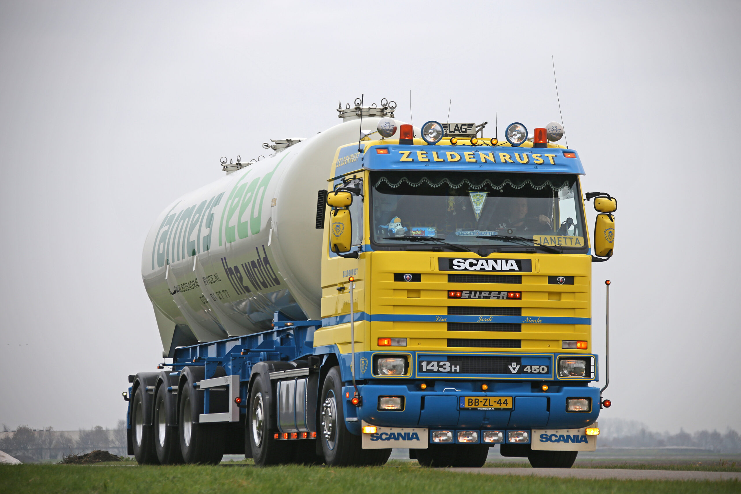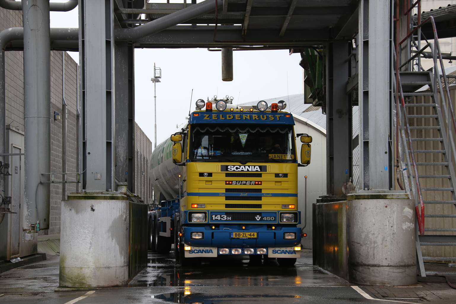Maar we gaan vandaag vooral met Schuimpie mee vanwege zijn auto. De Scania 143H V8 Streamline is namelijk twintig jaar oud en de teller staat op een respectabele 2.007.800 kilometer. “Ik zit nu vijftien jaar op deze auto. Daarvoor reed ik op een 143H Torpedo. Ik heb nooit problemen met mijn wagen. Ik poets hem elke week en door de week pak ik ook nog wel eens een doek om hem schoon te maken. En als het even kan, spoel ik ook de trailer af. Natuurlijk moet je met zo’n oud bakkie ‘s morgens niet als een malle wegrijden maar hem rustig op temperatuur kan komen. Olie verbruikt hij nauwelijks en grote storingen heb ik eigenlijk nooit gehad. Wel heeft hij één keer op zijn kant gelegen, bij het lossen, maar dat lag natuurlijk niet aan de Scania.”