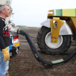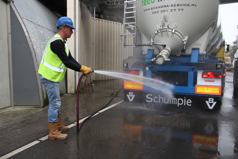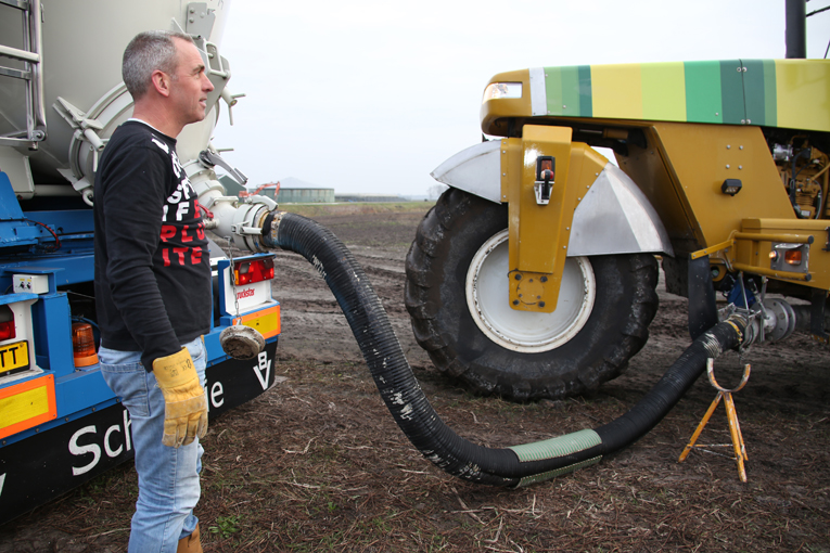 Op het land staat de sproeimachine al klaar. Het gevaarte moet vlakbij de achterkant van de trailer komen. Via een dikke slang kan de smurrie van de oplegger in de sproeimachine stromen. Het spul is goed te ruiken. Als de tank vol is, geeft de machinist een seintje en koppelt Lubbert de slang af. Hij rijdt vervolgens als een speer over het land. Met meterslange sproeiarmen wordt het goedje over het land verdeeld. Het ding kan drie keer uitrijden voor de tankoplegger leeg is. Daarna gaan we terug naar de fabriek in Hoogkerk.