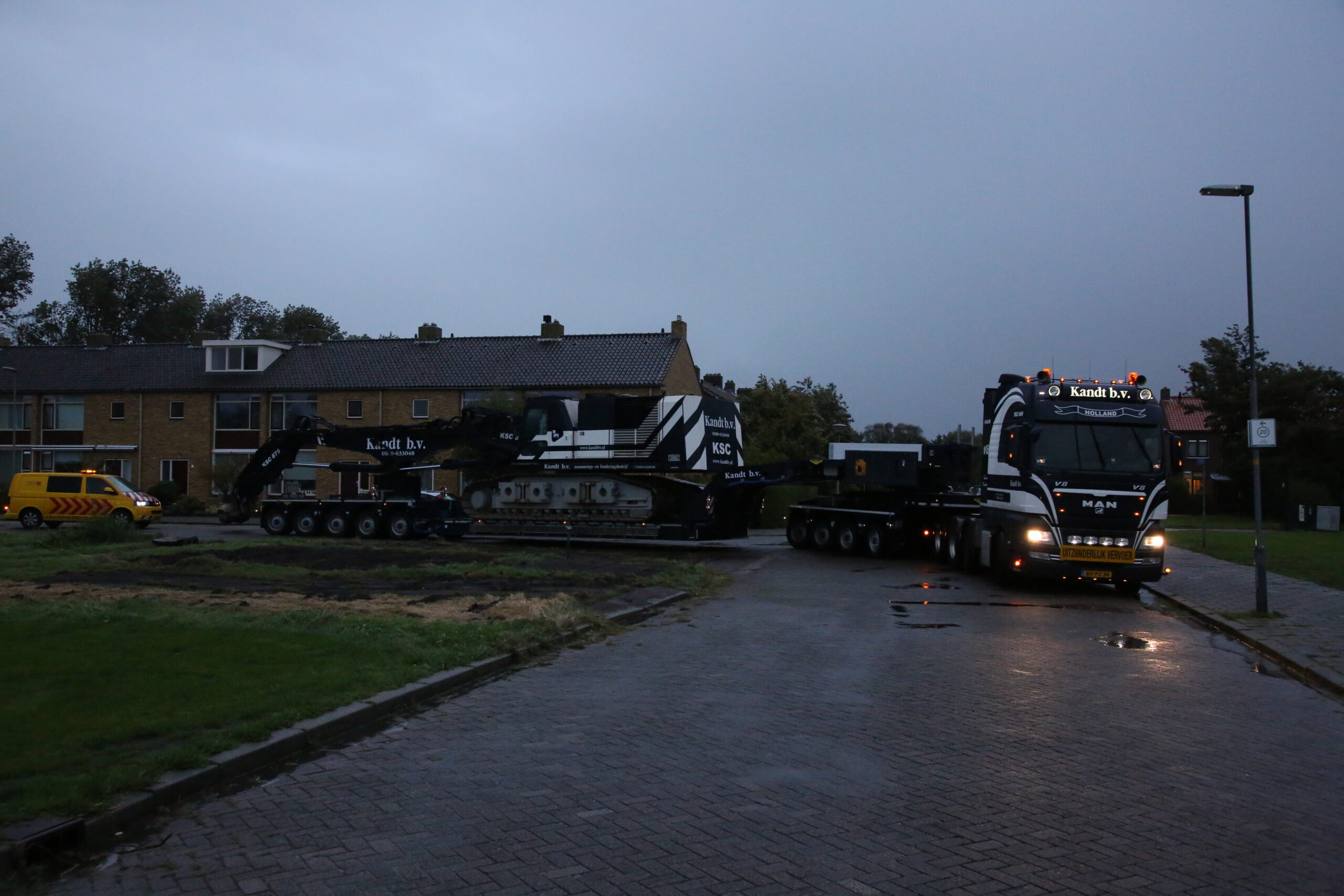 Achteruit rijdend bereikt de trailer tenslotte de ingang van het bouwterrein. Iedereen komt in actie. Kettingen worden losgemaakt, de oprijschotten komen tevoorschijn en terwijl Jeroen het diepbed op de grond laat zakken, komt de machine in beweging. “De nek kan wel van de dieplader af, maar eigenlijk los en laad ik alle machines via de zijkant”, zegt Jeroen. Hij zegt de machinist eerst de rechter rups te bewegen, iets achteruit te rijden en dezelfde handeling vooruit nogmaals te verrichten. Nu komt de machine dwars te staan en kan hij van de trailer hobbelen.