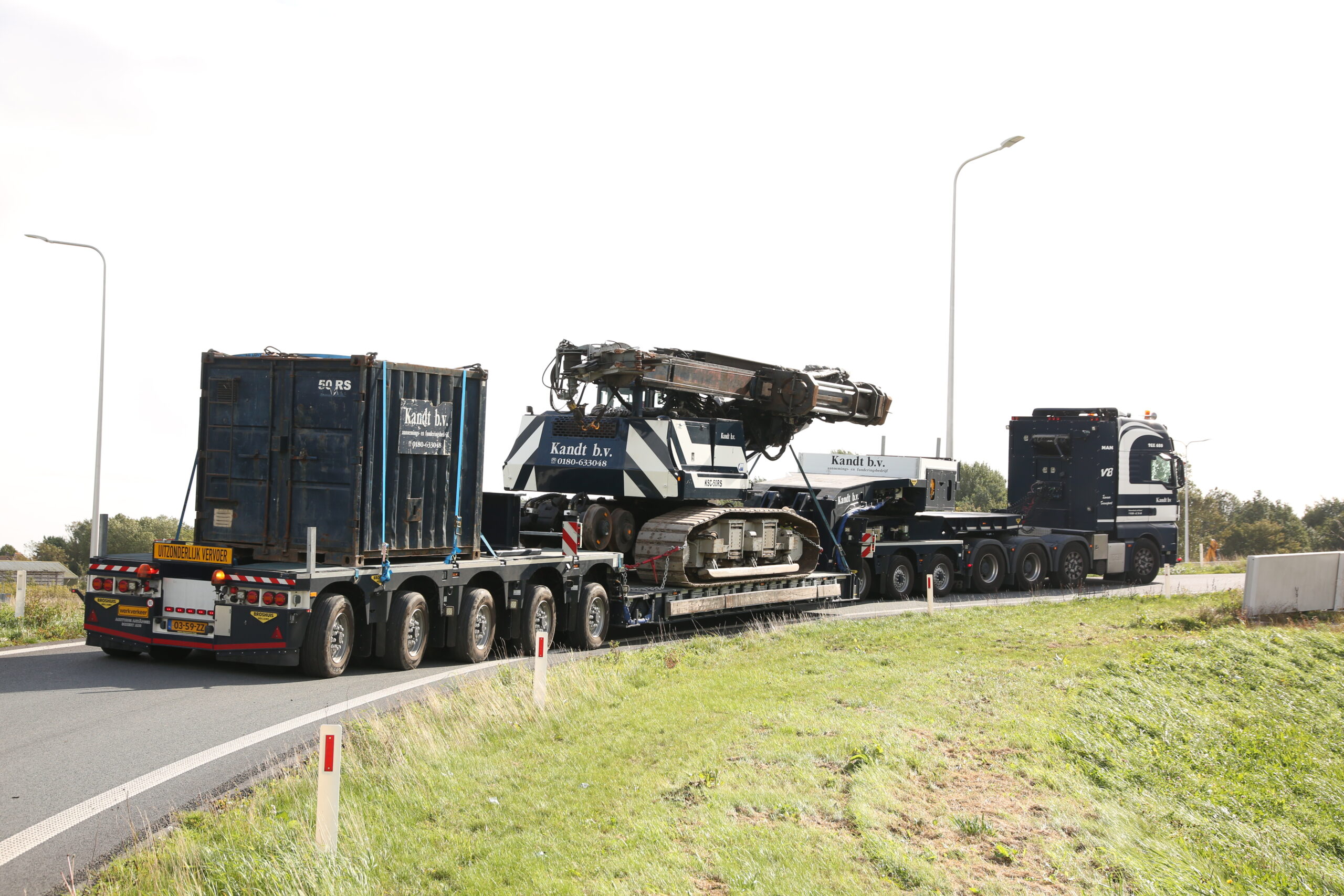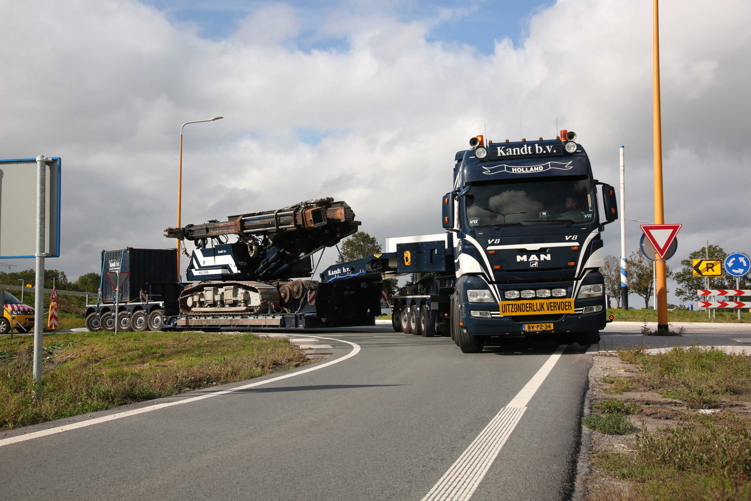 Inmiddels is Jeroen Bootsma gewend aan zijn nieuwe trailer achter de MAN TGX met 680 pk sterke V8-motor. Er staat een rit naar Noord-Holland op het programma. Op de trailer staat de door Kandt zelfgebouwde KSC 875. Deze machine met driedelige giek zal in het weekend een planken damwand rond station Den Helder Zuid installeren. Vanwege het treingewicht van 160 ton is er een bijzondere route uitgestippeld. We gaan vanuit Nieuwerkerk aan den IJssel via de ring van Amsterdam de A7 op om er bij Middenmeer weer af te gaan. Dan rijden we via de N242 en N241 langs Schagen om daar de N9 richting Den Helder te nemen. Op die weg krijg je goed in de gaten hoeveel rotondes er zijn. Vooral op de N241 naar Schagen: daar is bij iedere kruising of afslag zo’n hindernis aangelegd.
