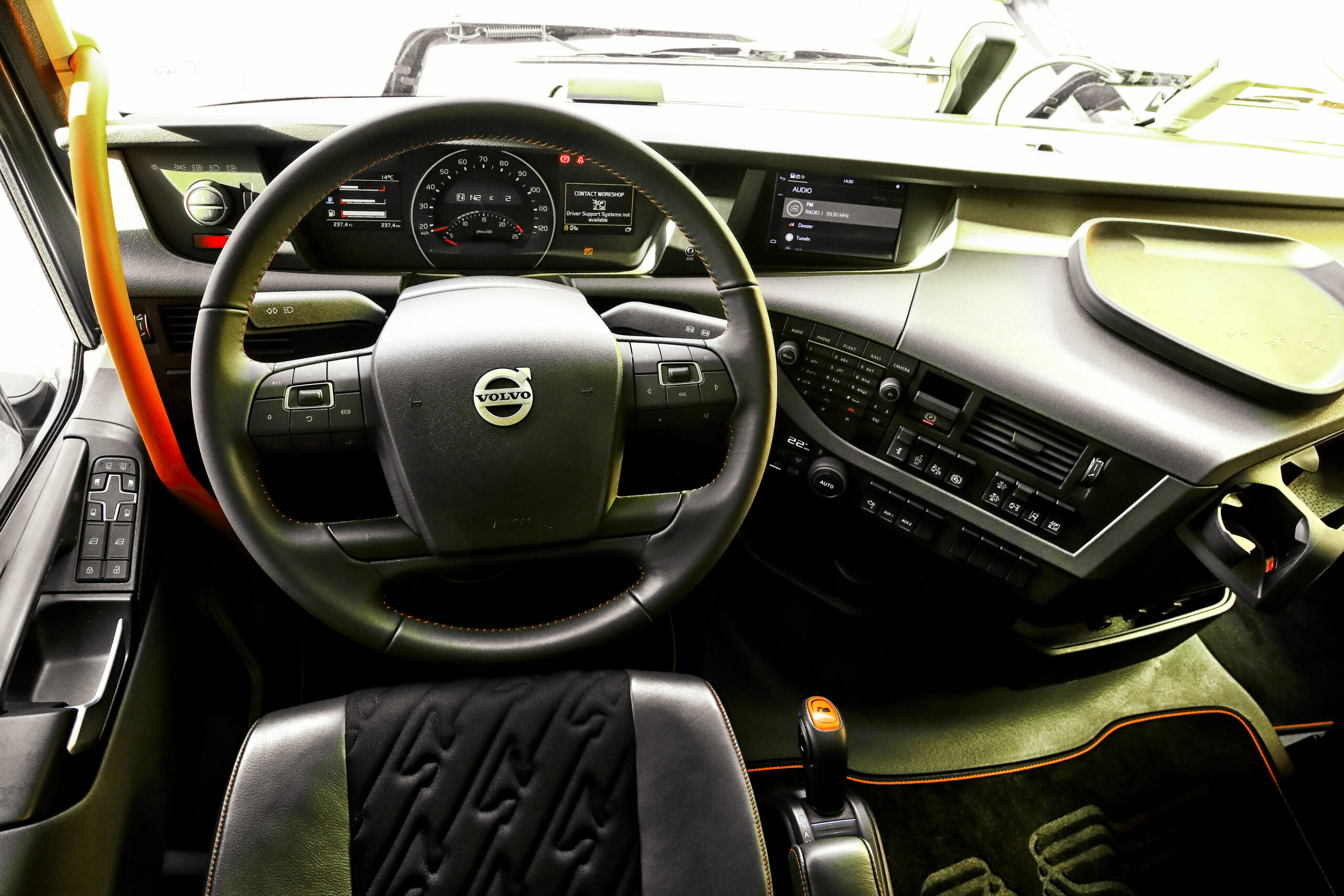 Ik weet zelf nog dat we over de handrem Volvo FH12 schreven dat die ‘op de enige juiste plek zat’, namelijk voor op het dashboard. Daar zit hij bij de FH13 25 Year Special Edition nog steeds. De handrem van een Volvo is tegenwoordig elektrisch (optie) en fungeert meteen ook als terugrolrem. Wat verder opvalt, is dat het ‘digiloge’ dashboard van de FH13 een veel kleinere toerenteller heeft dan de stoere klok in de Volvo FH12. “Die heb je ook nodig. Jullie hebben I-Shift dat zelf de beste schakelstrategie bepaalt. Mijn F12 schakel je nog met de hand”, zegt Jan.