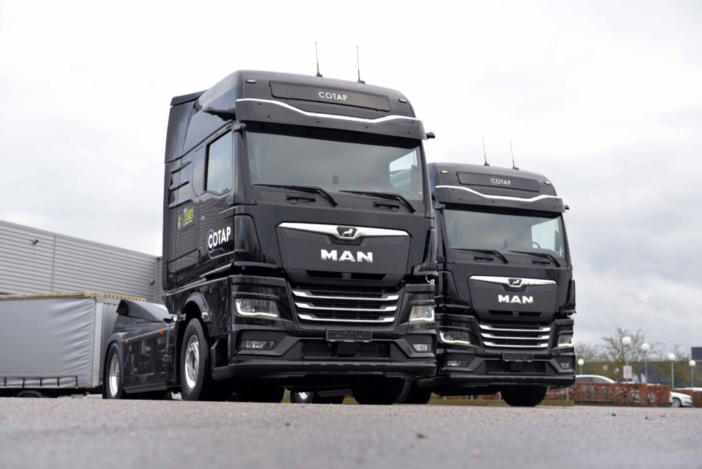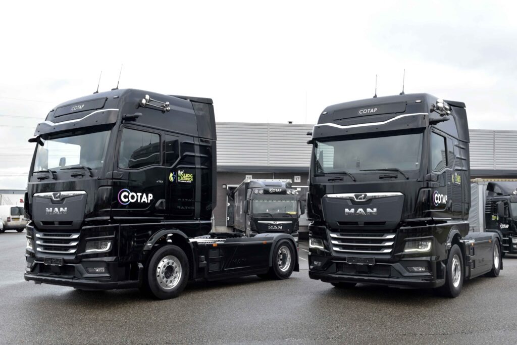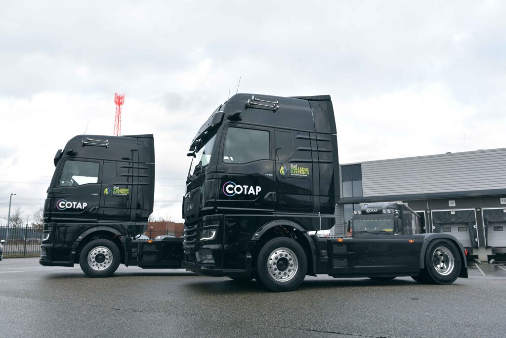 Cotap heeft een vloot van zo’n dertig voertuigen, allemaal van het merk MAN. Dat de eerste stap op het gebied van elektrificatie ook met MAN wordt gezet, lag dan ook voor de hand. Naast 22 trekkers heeft Cotap vier bakwagens en vijf MAN TGE bestelwagens. De vloot rijdt al grotendeels op HVO100 biobrandstof, waarbij de meeste personenwagens reeds elektrisch rijden. De volgende stap op weg naar duurzaamheid wordt nu gezet met de twee volledig elektrische trucks.