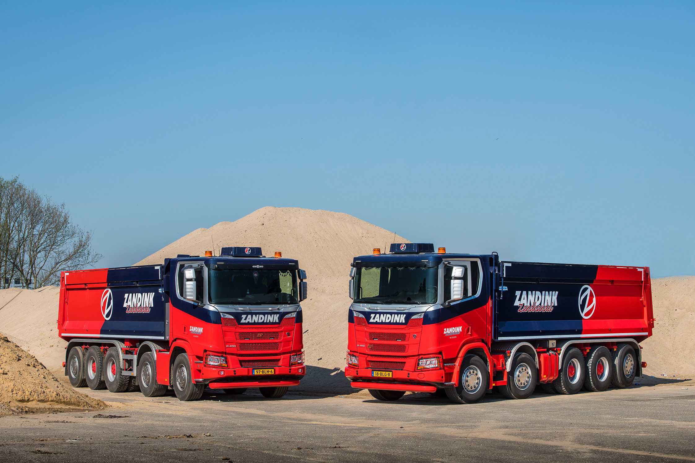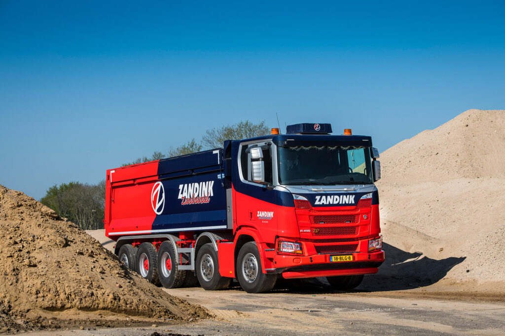 Zandink Zandhandel met vestigingen in Nijkerk, Baarn en Amersfoort, nam recent twee nieuwe Scania’s R450 10×4*6 XT met twee sturende voorassen, een tandemstel, een hefbare meesturende naloopas en een kipperopbouw van Gijsbertsen in gebruik. Het zijn de eerste twee voertuigen van dit merk voor het bedrijf.