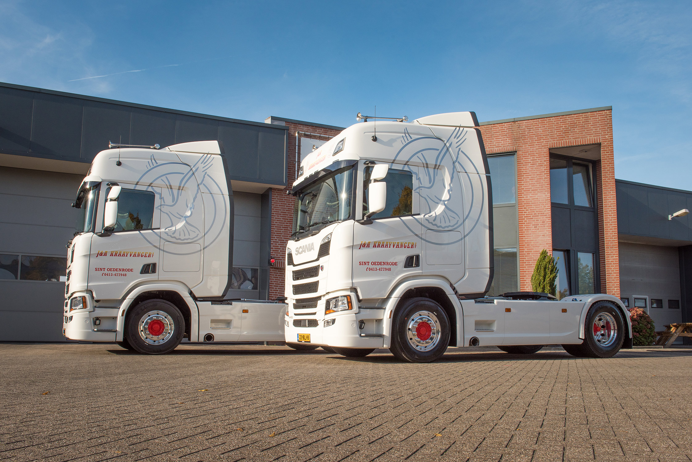 Eigenaar Jan Kraayvanger van het gelijknamige transportbedrijf in Sint–Oedenrode kreeg onlangs de sleutels overhandigd van twee nieuwe Scania’s. “Ik heb er één gekocht als vervanging voor een R500 V8 en één als uitbreiding van de bedrijfsvoering. Die chauffeur komt van een Scania R420 maar die auto blijft nog bij ons rijden.”