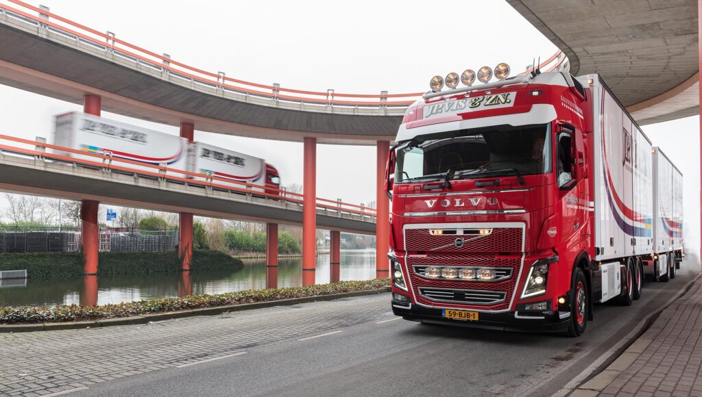 De vaste routes van J.P. Vis Transport voeren deels over het water. De Zweden-specialist heeft in Malmö zes dolly’s waarmee met de veerboot aangekomen opleggers achter een bakwagen kunnen worden gekoppeld. “We rijden met drie 40-tons trucks door Duitsland naar de haven in Travemunde en gaan met twee 60-tons LZV-combinaties verder Zweden in”, legt René Vis uit. “De wetgeving rond LZV-transport is daar sinds kort versoepeld. Er mag nu, op bepaalde wegen en op ontheffing, met twee trailers gereden worden. Tot voor kort mocht dat alleen op de E6 tussen Malmö en Gotebörg. De nieuwe mogelijkheden houden ook een verruiming van het tonnage in, dat gaat tot 80 ton treingewicht. Dat betekent voor ons efficiënter transport met minder CO2-uitstoot. De vergunning is al aangevraagd.”