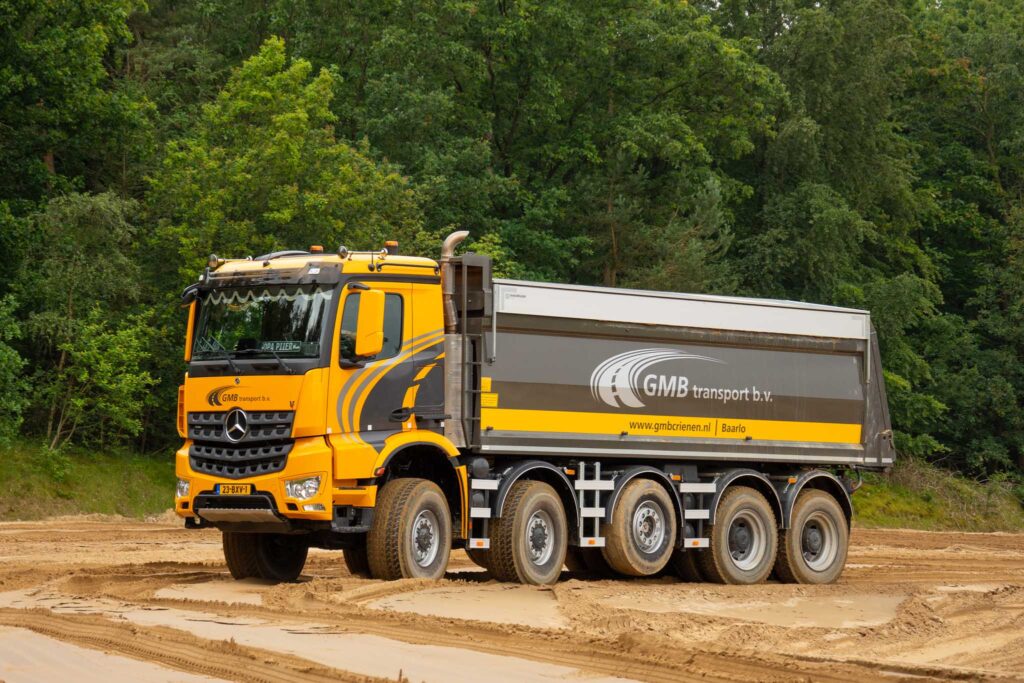 GMB Transport uit het Limburgse Baarlo nam dit jaar hun tweede Mercedes-Benz Arocs 10×8 kipper in gebruik. De twee Arocssen werden de afgelopen periode door GMB ingezet voor zwaar dumperwerk op een zandwinning.