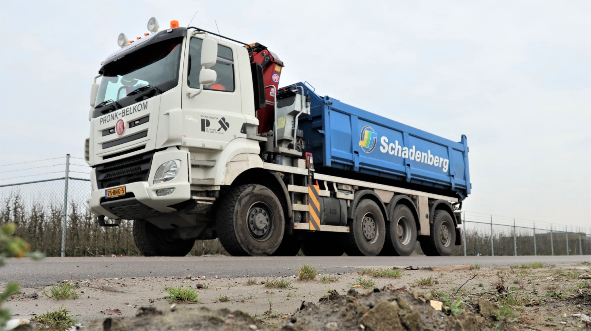 Het grootste deel van de transporten die familiebedrijf Pronk-Belkom verricht, is kieper/kraan gerelateerd. Men rijdt zand, grond, puin, asfalt en andere los gestorte goederen maar is ook met diverse voertuigen actief in de gladheidsbestrijding. Het werkgebied strekt zich uit over Noord-Holland, Zuid-Holland en Friesland. In de meeste gevallen gelden de Pronk-Belkom voertuigen als de ‘flexibele schil’ voor aannemers en andere vervoerders in de grond-, weg- en waterbouw. Niet zelden vervoeren zij achter de kippers ook een dieplader met de benodigde machines. Ook de onlangs aangeschafte DAF 4×2 trekker is een multifunctioneel inzetbaar voertuig. Zeker door de recent in gebruik genomen Fliegl-trailer met een horizontaal lossysteem. Een toepassing die ook op de vorig jaar door Truckland geleverde Ginaf is gemonteerd. Hans Pronk: “Wij lossen vaak zand in schuren van tulpenbroeierijen, maar ook in tunnels en op wegen met veel portalen. Dan is dit echt een prima oplossing!”