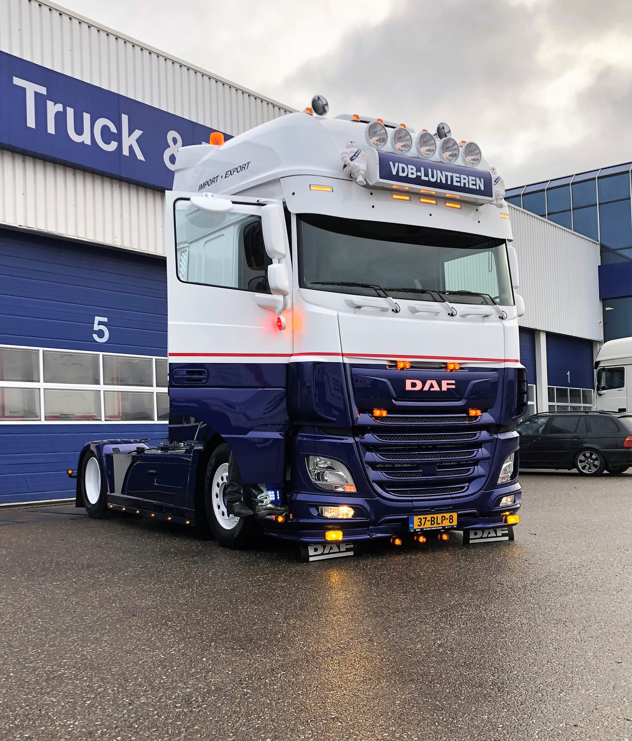 ,,Het is een beetje een uit de hand gelopen hobby,’’ vertelt René van den Berg van VDB import/export. ,,Het is een paar jaar geleden begonnen met het plaatsen van een paar extra lampen op een nieuwe auto, maar van lieverlee is het steeds meer geworden. En tegenwoordig is het bijna onze huisstijl. Zeven van de acht auto’s uit ons wagenpark zijn helemaal opgetuigd met lampen, lichtbakken, zonnekleppen, traanplaten en wat niet al. Dit is de eerste DAF die we hebben aangeschaft; de andere zijn alle van Zweedse makelij.’’