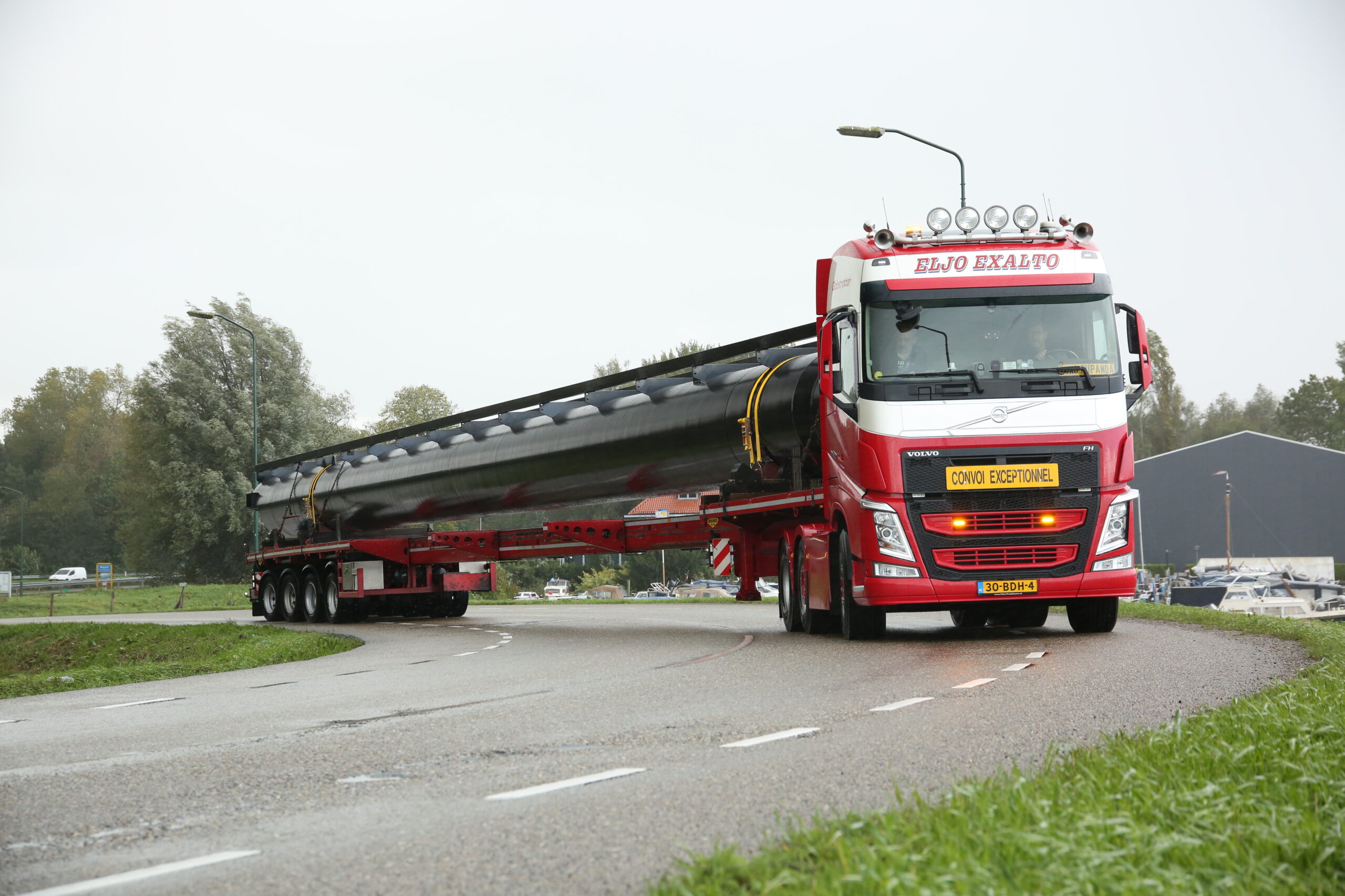 Spannend is het voor de heren niet meer. Paul: ,,Ik doe nu 28 jaar speciaaltransport waarvan het meeste hele lange ladingen zijn maar ook weleens brede lading. Het industrieterrein hier in Waspik kom ik al bijna net zolang en heeft behoorlijk veel ruimte. Alleen de haakse bocht bij de snelweg moeten we met deze lengte een keer terug steken.’’ Van die 28 jaar werkt Paul er 12,5 jaar bij Eljo Exalto waar hij het prima naar zijn zin heeft. ,,Ik mocht meedenken in de keuze van de auto en de opbouw van de kisten. Ik ben dan ook zeer tevreden met de Volvo FH 540.’’