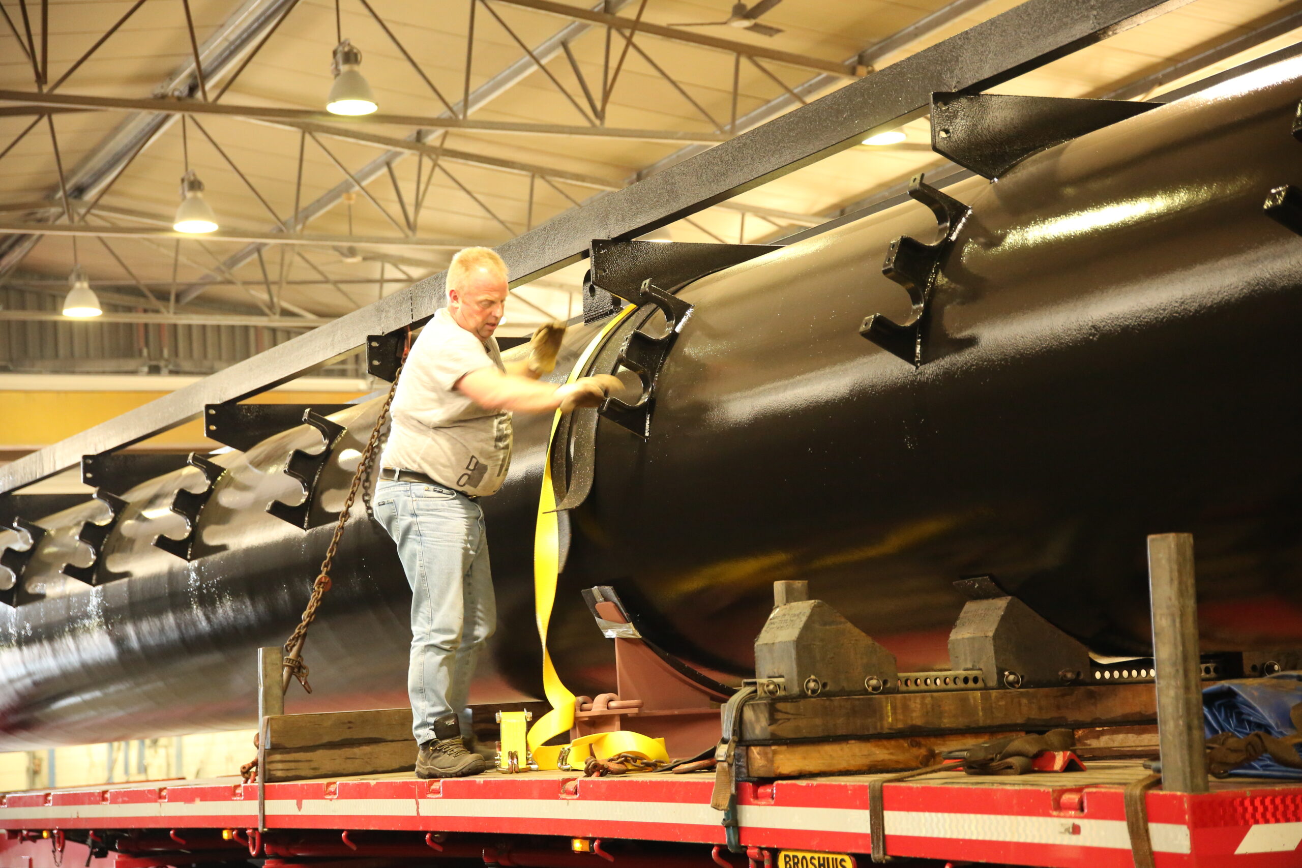 In de kantine van Spuiterij Straco in Waspik treffen we Kees van Maaren en Paul Roelof, beter bekend als Paultje. Beide heren rijden bij Eljo Exalto Transport en zijn aan het discussiëren wie de laatste rit van in totaal 11 ritten mag rijden. Want, zo grappen ze, die moet mee op de boot naar Curaçao om daar de lading weer rond te rijden. De mannen hebben vanmorgen vroeg al gelost op de Maasvlakte waarvandaan het per schip naar het eindland in de Caribische zee zal en zijn nu terug voor de langste delen. De 11 delen vormen samen een constructie voor een enorme loopbrug en hebben lengtes van 32 tot 42 meter. Ieder deel is een ronde buis met daaraan allerlei constructies gemonteerd.
