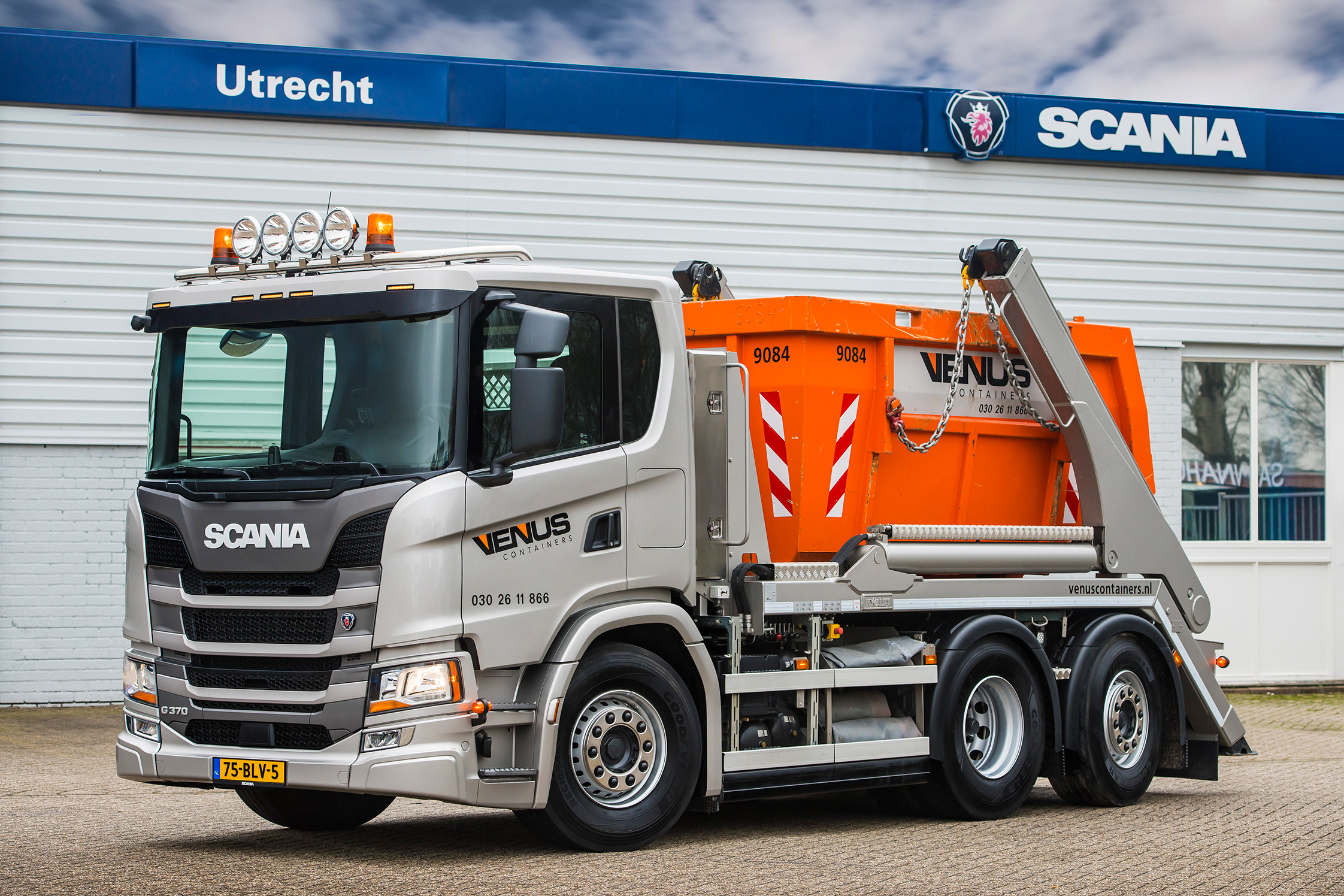 Venus Containers in Maarssen nam recent een nieuwe Scania G370 6×2*4 met een portaalarm van Hyva in gebruik. Het bijzondere aan de auto is de ultrakorte draaicirkel dankzij de zeer korte wielbasis van slechts 3,15 meter.