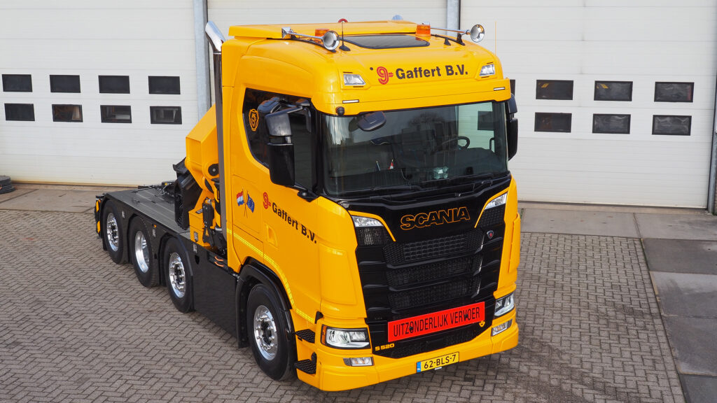 Recent nam hijsspecialist Gaffert in Veghel een bijzondere Scania S520 8×2/*6 in gebruik. De auto is ultrakort gebouwd met een triple-as opstelling en kan zo met drie sturende assen optimaal manoeuvreren in krappe ruimtes als fabriekshallen. Dit is het eerste voertuig dat in deze configuratie bij Scania helemaal af-fabriek van de band is geleverd.