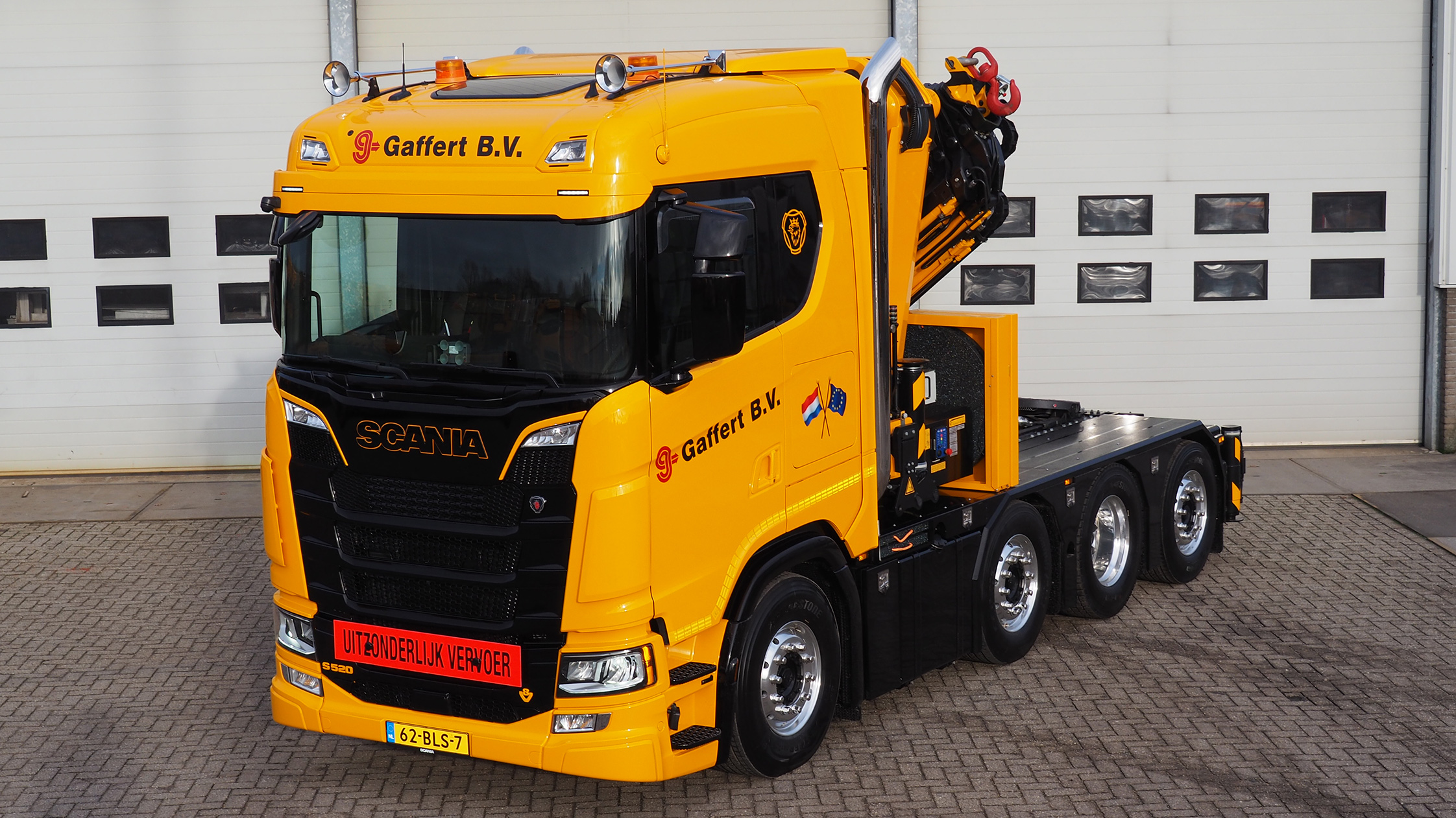 Recent nam hijsspecialist Gaffert in Veghel een bijzondere Scania S520 8×2/*6 in gebruik. De auto is ultrakort gebouwd met een triple-as opstelling en kan zo met drie sturende assen optimaal manoeuvreren in krappe ruimtes als fabriekshallen. Dit is het eerste voertuig dat in deze configuratie bij Scania helemaal af-fabriek van de band is geleverd.