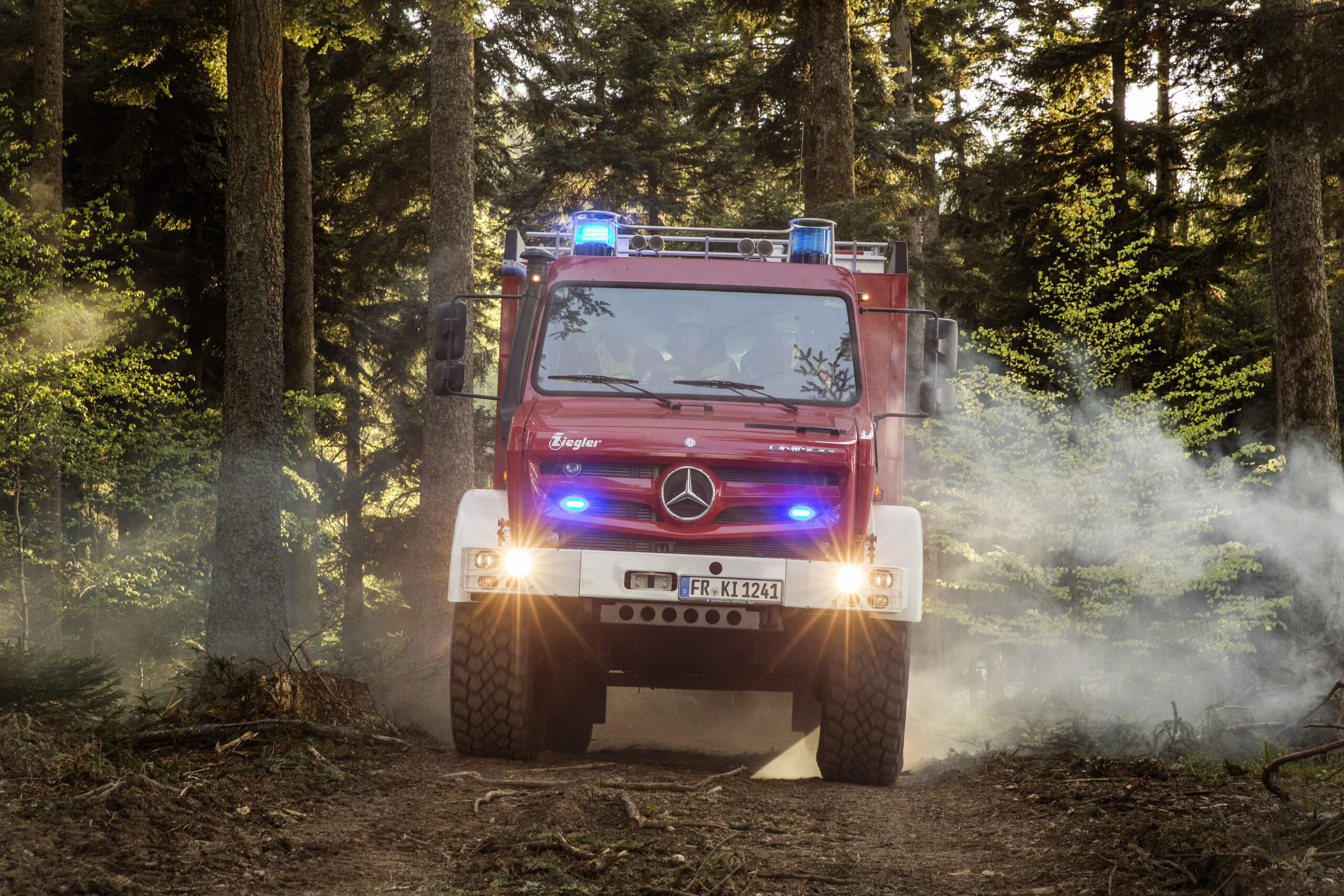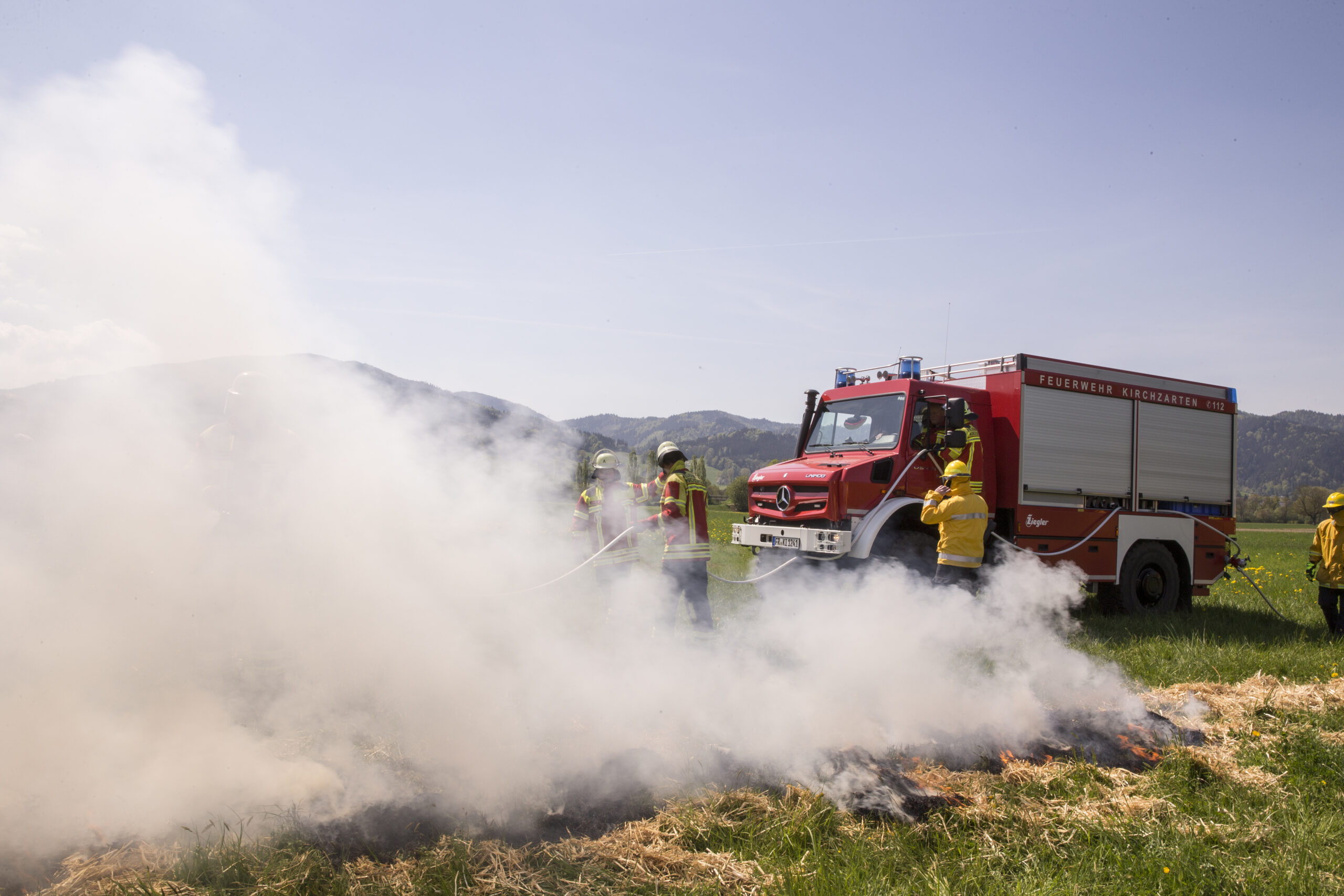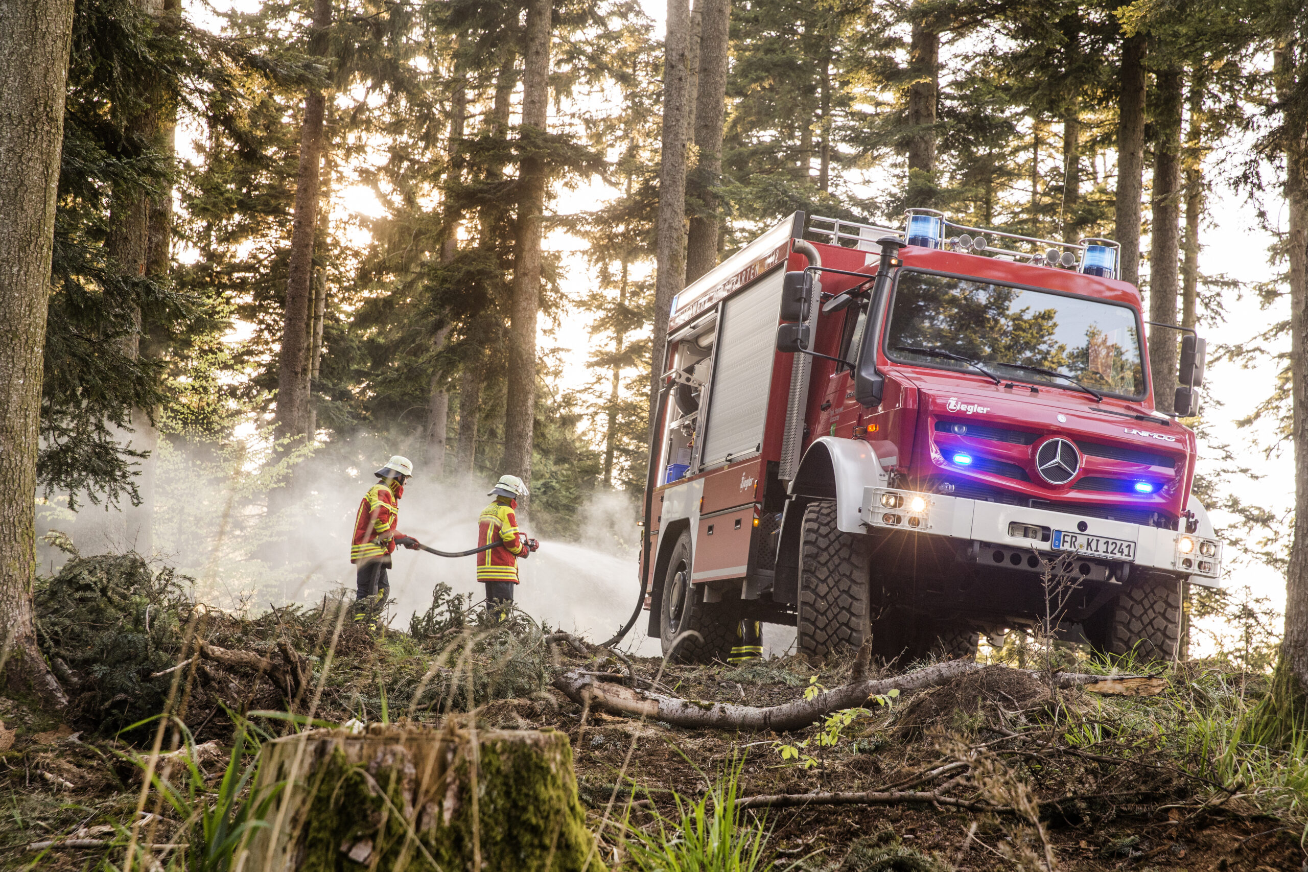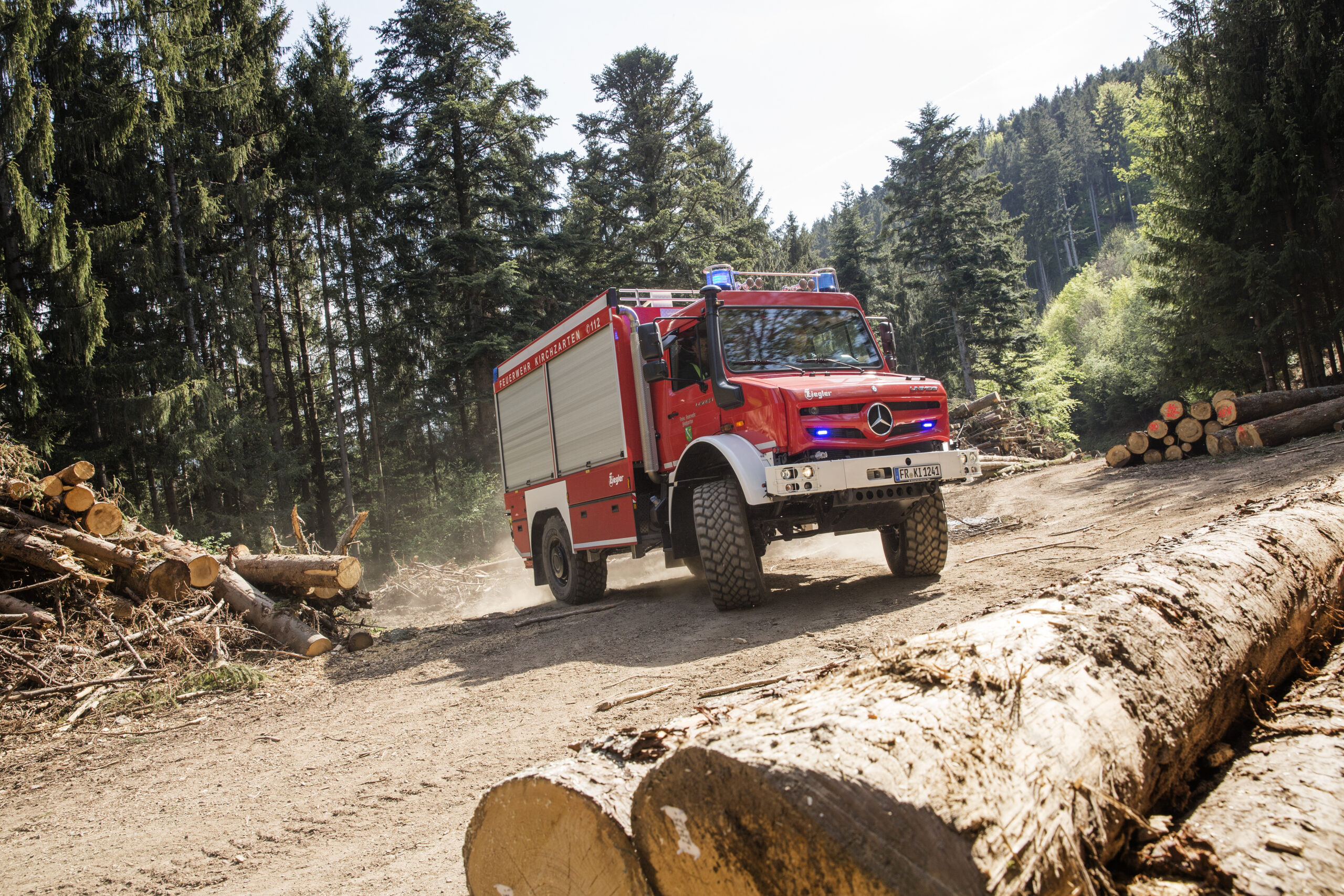Niet alleen bossen, ook bermen en open velden kunnen door de droogte makkelijk vlam vatten. Gewone brandweerwagens komen al snel vast te zitten als ze over mulle paden of tegen steile hellingen op moeten. Danzkij zijn grote bodemvrijheid van 45 cm, zijn vierwielaandrijving en brede terreinbanden kann de Unimog van de vrijwillige brandweer van Kirchzarten (in Hoog-Schwarzwald) op de extreemste plekken komen om branden te bestrijden.