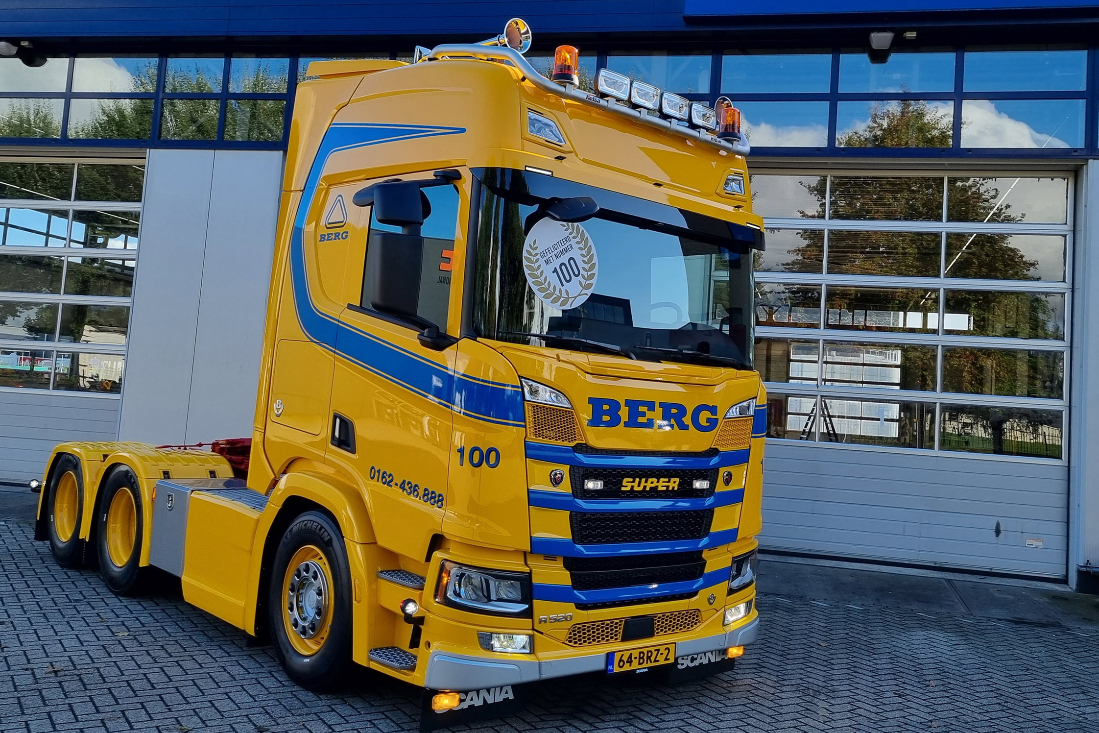 Van den Berg Transport & Montage is een logistieke dienstverlener voor de bouw en het wegennetbeheer en -onderhoud. Het bedrijf nam afgelopen maand met een Scania 6×2 R520 V8 Highline zijn 100ste truck in gebruik sinds de oprichting in 1953. De truck is overigens de laatste van een bestelling van vier. Eerder dit jaar zijn er twee G450 voertuigen en een R520 geleverd.