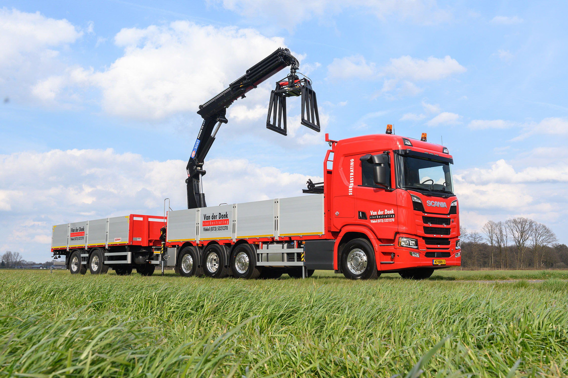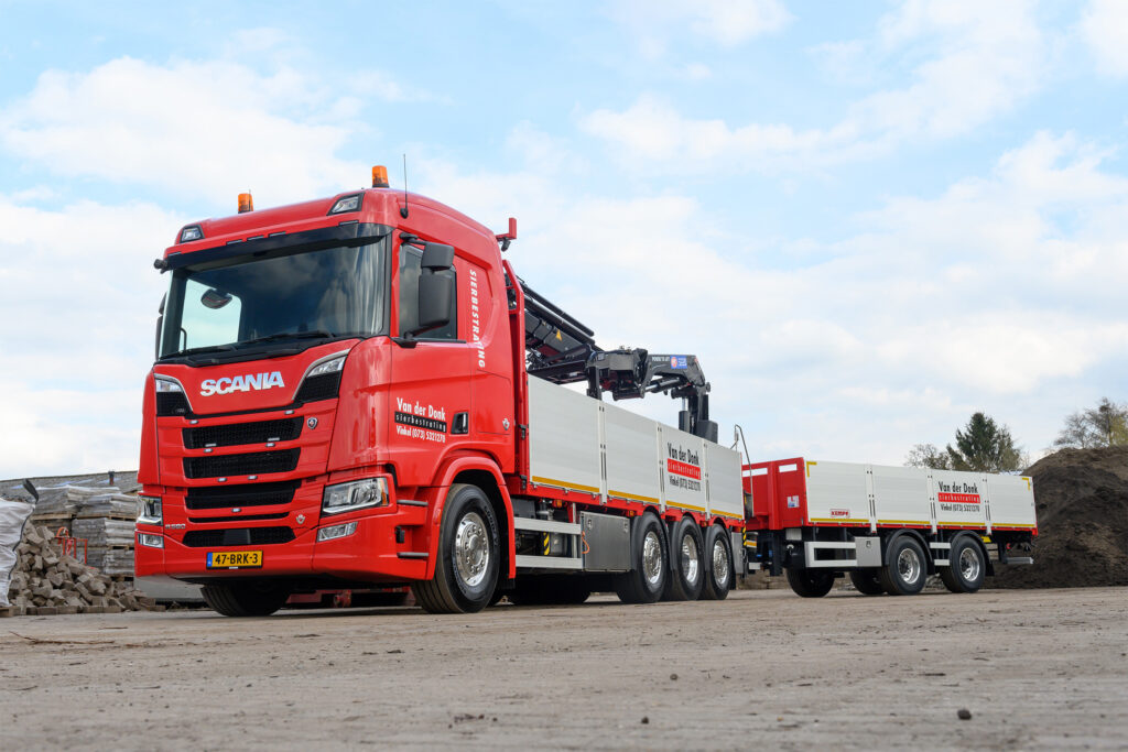 Ondanks het feit dat de nieuwe Scania R580 de meeste kilometers op de snelweg maakt, koos Van der Donk in overleg met de Scaniadealer in Veghel toch voor een vierasser met één aangedreven as en drie sturende assen. “Dat zit met name in de laatste kilometers. Dan gaan vaak de woonwijk in. Daarom staat er ook een wipkar achter deze Scania: die kan de chauffeur makkelijk even afkoppelen. Soms moet hij dan de tassen stenen even overpakken met de Hyva kraan die achterop de bakwagen staat. Onze andere R580 is een 8×4; dus met twee sturende voorassen. Maar bouwplaatsen zijn tegenwoordig eigenlijk altijd verhard. Wij komen dus nooit van de weg af. Daarom durfden we het nu aan bij de nieuwe te kiezen voor één aangedreven as in combinatie met een gestuurde voor- en naloper. Dat manoeuvreert toch nóg strakker en daar hebben we straks veel plezier van in de woonwijken.”
