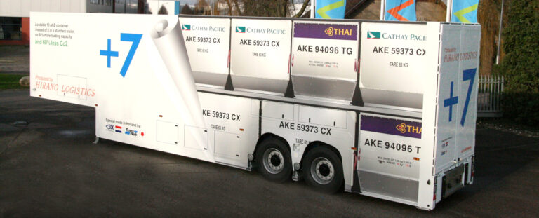 In de nieuwe Van Eck-trailer kunnen containers van het type AKE in twee lagen geladen worden. Maar liefst dertien van deze luchtvrachtcontainers kunnen mee. Maar er kunnen ook vier grote ‘platen’ geladen worden, plus nog eens vijf AKE’s.