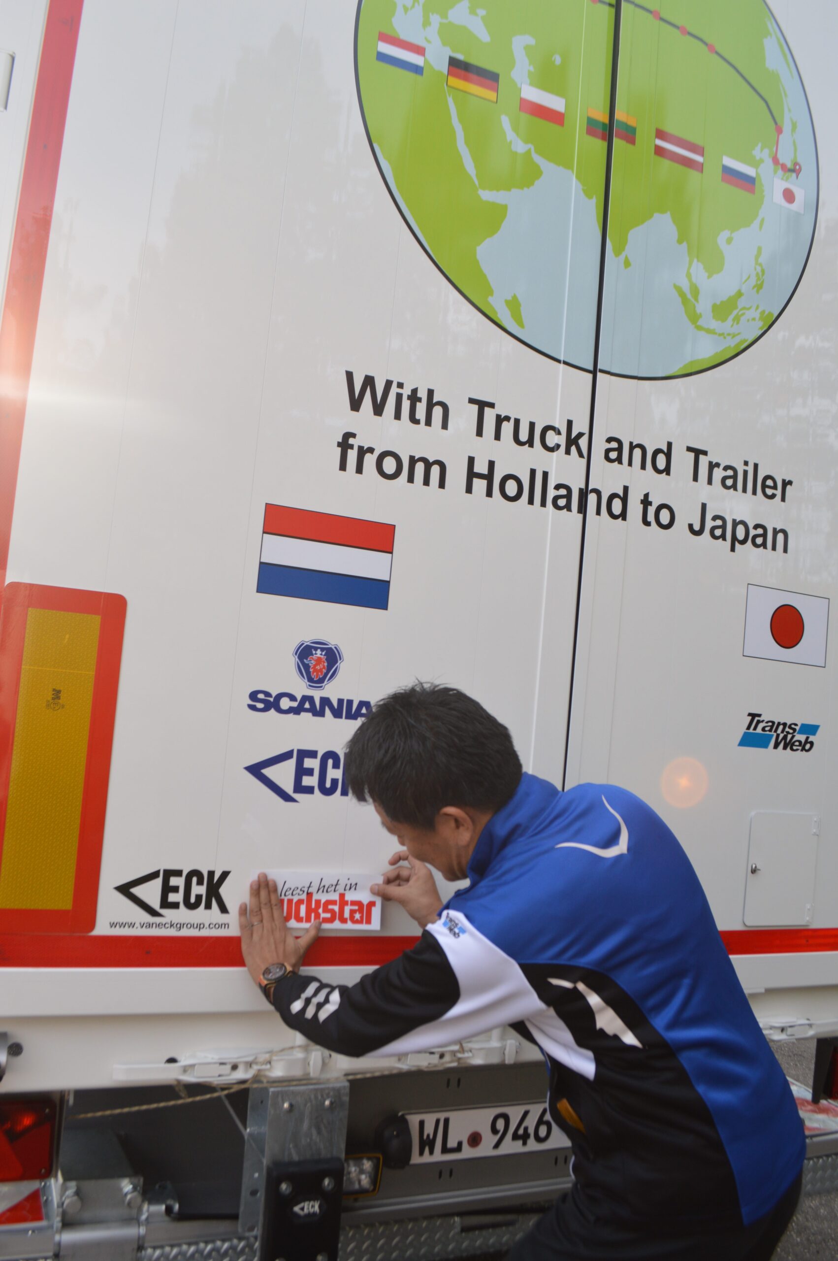 Voor de start van de rit plakt Takeshi nog snel een Truckstar-sticker op de trailer: wie weet of ze in Siberië het flappenteam van Truckstar misschien nog tegenkomen.