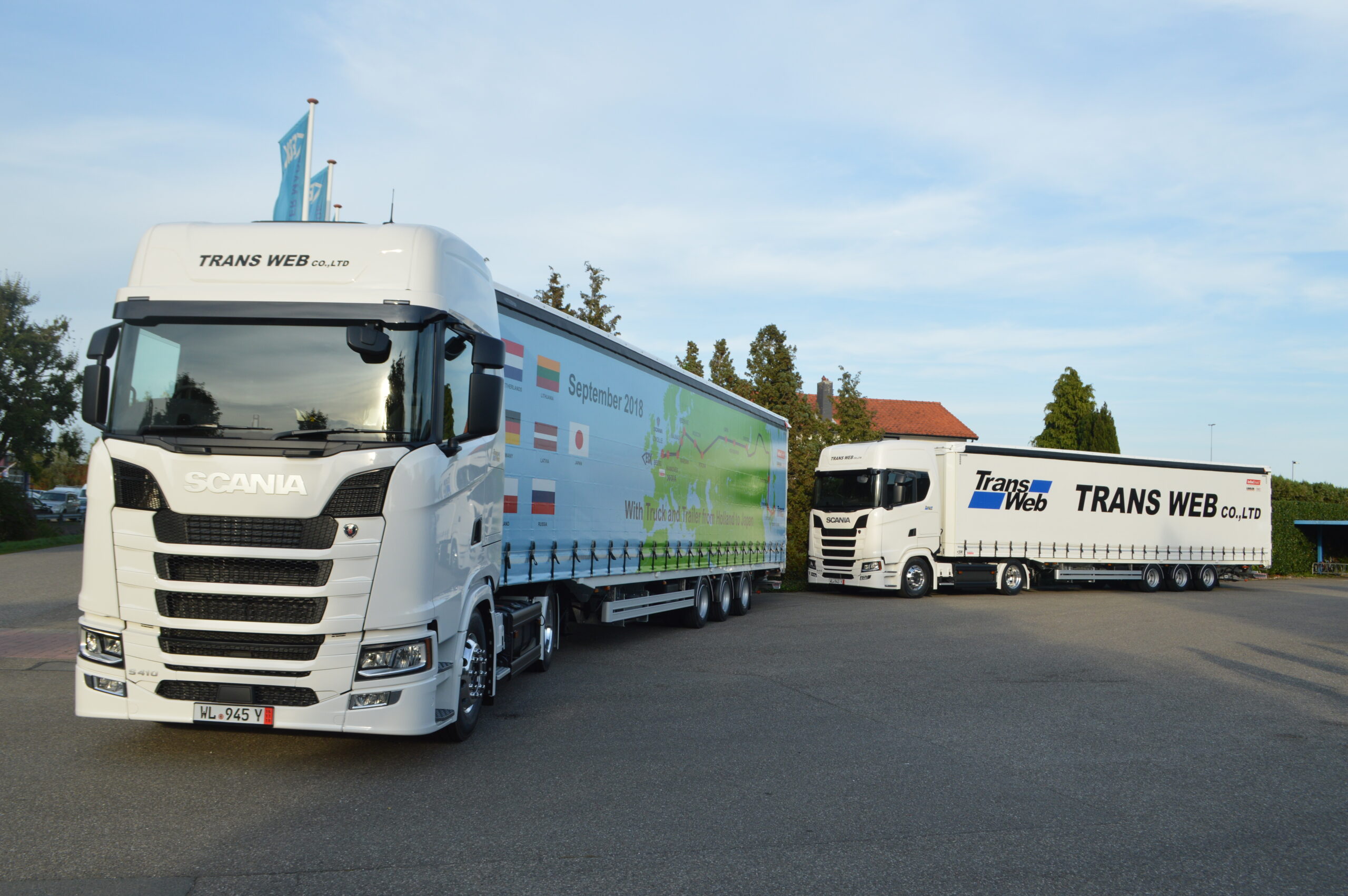 De start was bij trailerbouwer Van Eck in Beesd, waar Takeshi al diverse nieuwe luchtvrachttrailers heeft laten bouwen. De trekkers zijn splinternieuwe Scania’s met 410 pk. En natuurlijk het stuur aan de rechterkant, want in Japan rijden ze links. De nieuwe combinaties zullen deel gaan uitmaken van het wagenpark van TransWeb in Japan, een transportbedrijf dat zeventien jaar geleden door Takeshi is opgericht. Het bedrijf heeft ruim honderd vrachtwagens op de weg, waarvan de helft van het merk Scania.