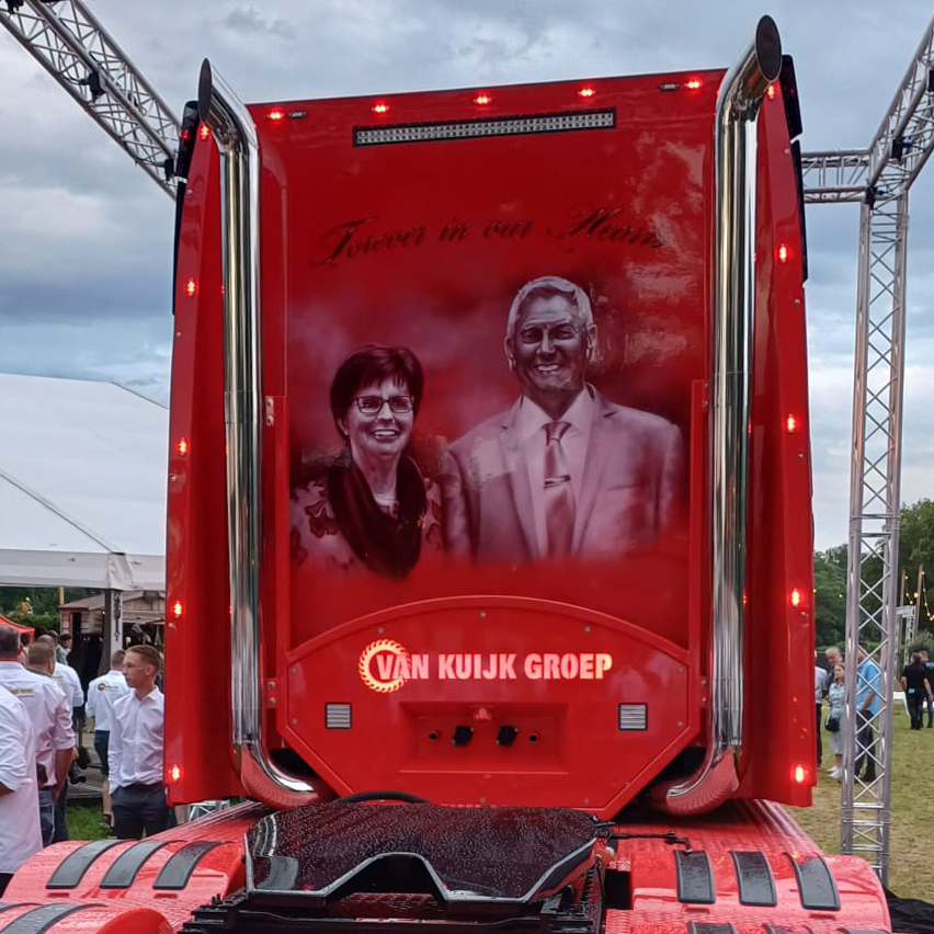 Op zondag 30 juni vierde het bedrijf haar 55-jarig jubileum met een open dag in Helvoirt. Als een bijzonder goed geslaagde verrassing werd daar een zeer fraaie jubileumtruck onthult in de vorm van een Volvo FH met neus. De Volvo VT5 is door Vlastuin voorzien van een torpedo neus en opgebouwd met extra verlichting, achterbumper en staande uitlaten. Wat deze Volvo extra bijzonder maakt is de special paint op de achterzijde van de cabine. De grondleggers van het bedrijf zijn namelijk vereeuwigd op de jubileumtruck en dat is een mooi eerbetoon aan de in januari overleden Tiny van Kuijk.