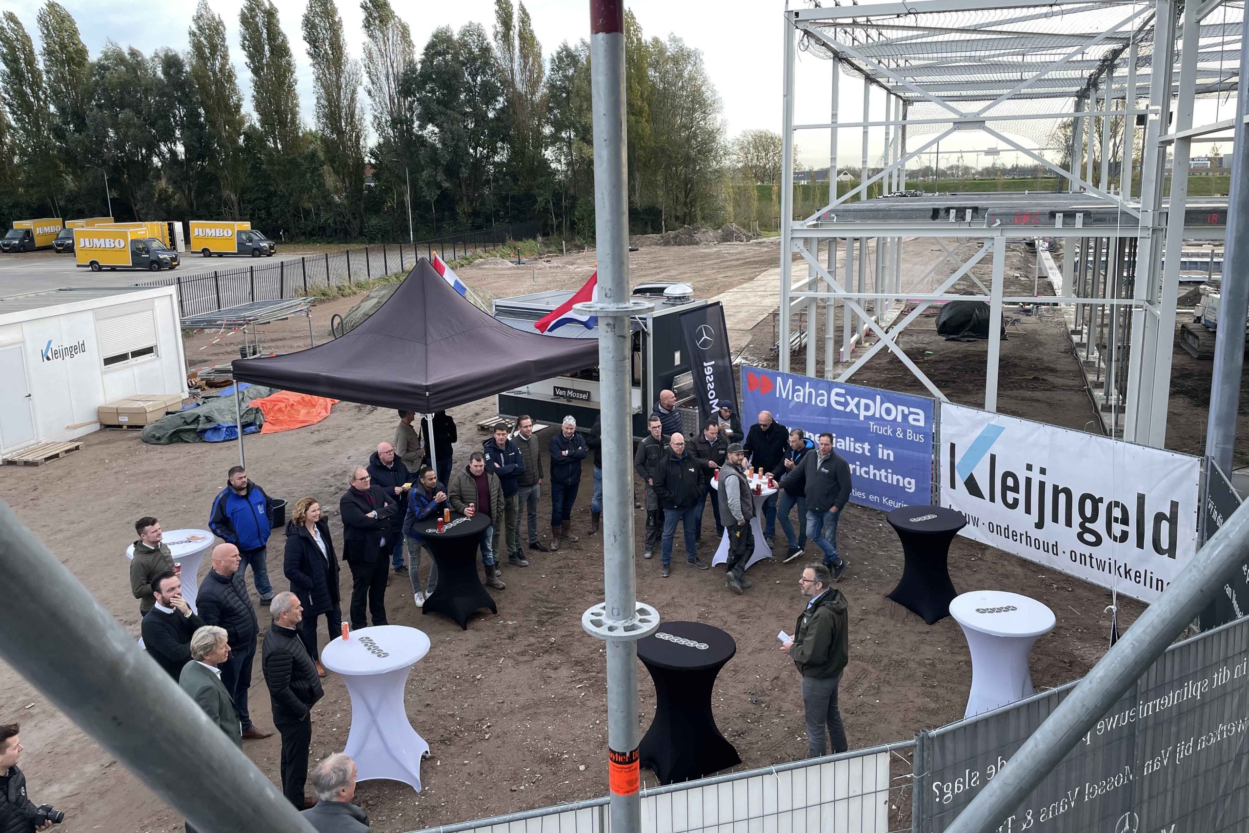 In aanwezig van het verantwoordelijke bouwpersoneel, de directie van Van Mossel Vans & Trucks en Eric Berkhof – CEO van Van Mossel – werd er geproost op deze mijlpaal. Naar verwachting is het pand in het tweede kwartaal van 2023 gereed.