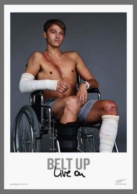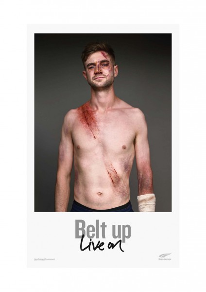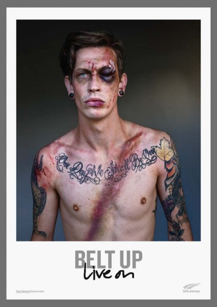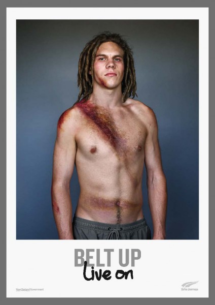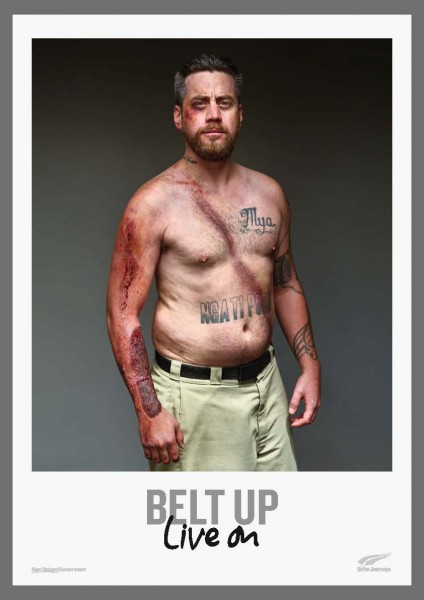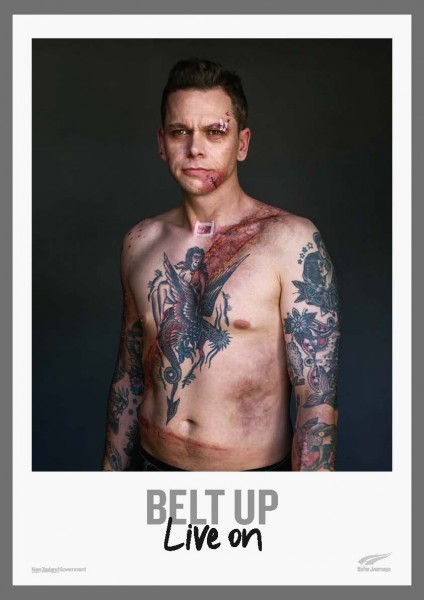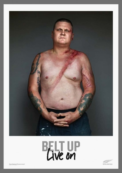 In Nieuw-Zeeland is de overheid een bijzondere campagne gestart om het gebruik van veiligheidsgordels aan te moedigen. De campagne werkt met foto’s van mannen die dankzij de gordel een verkeersongeval hebben overleefd.