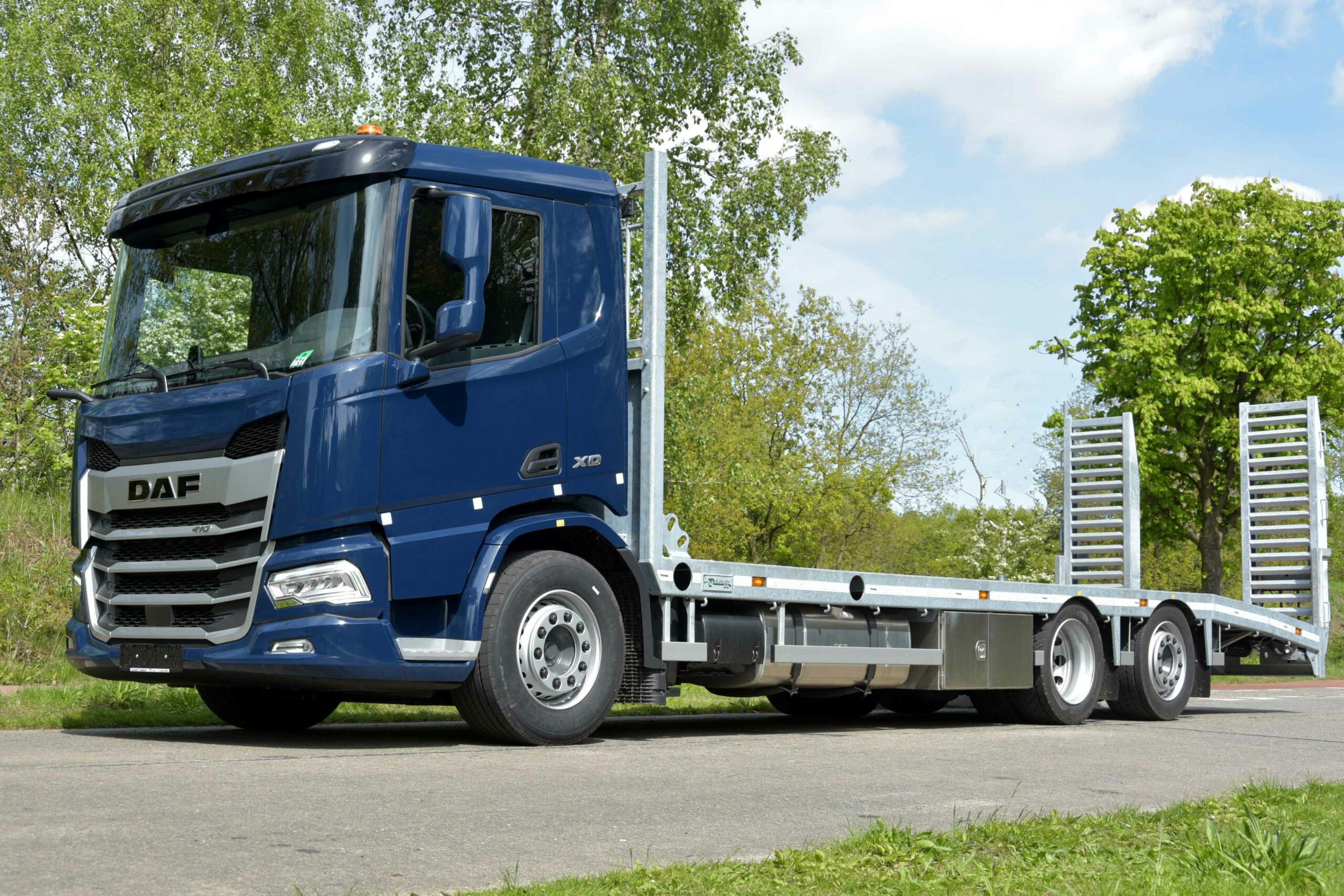 De DAF XD oprijwagen is voorzien van de MX11 krachtbron met 410 pk, in combinatie met de automatisch schakelende TraXon versnellingsbak. De DAF XD cabine is ruim en comfortabel, en is zelfs voorzien van een koelkast tegen de achterwand. Eén van de sterke punten van de nieuwe generatie van DAF is het uitstekende uitzicht vanuit de cabine. In combinatie met de speciale Corner View dode hoek camera en de dode hoek sensoren is dit een uiterst vriendelijk, en dankzij de sturende naloopas wendbaar voertuig voor in de binnenstad. Veldhuizen Trucks heeft momenteel drie van deze trucks staan voor de verhuur.