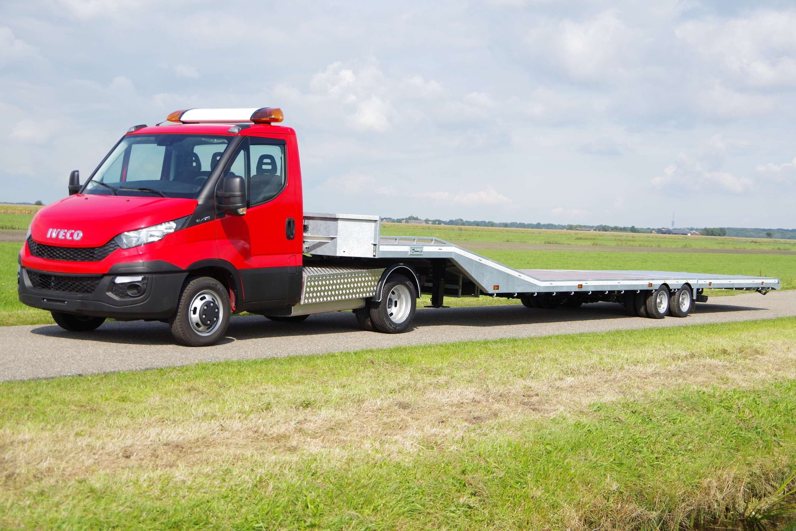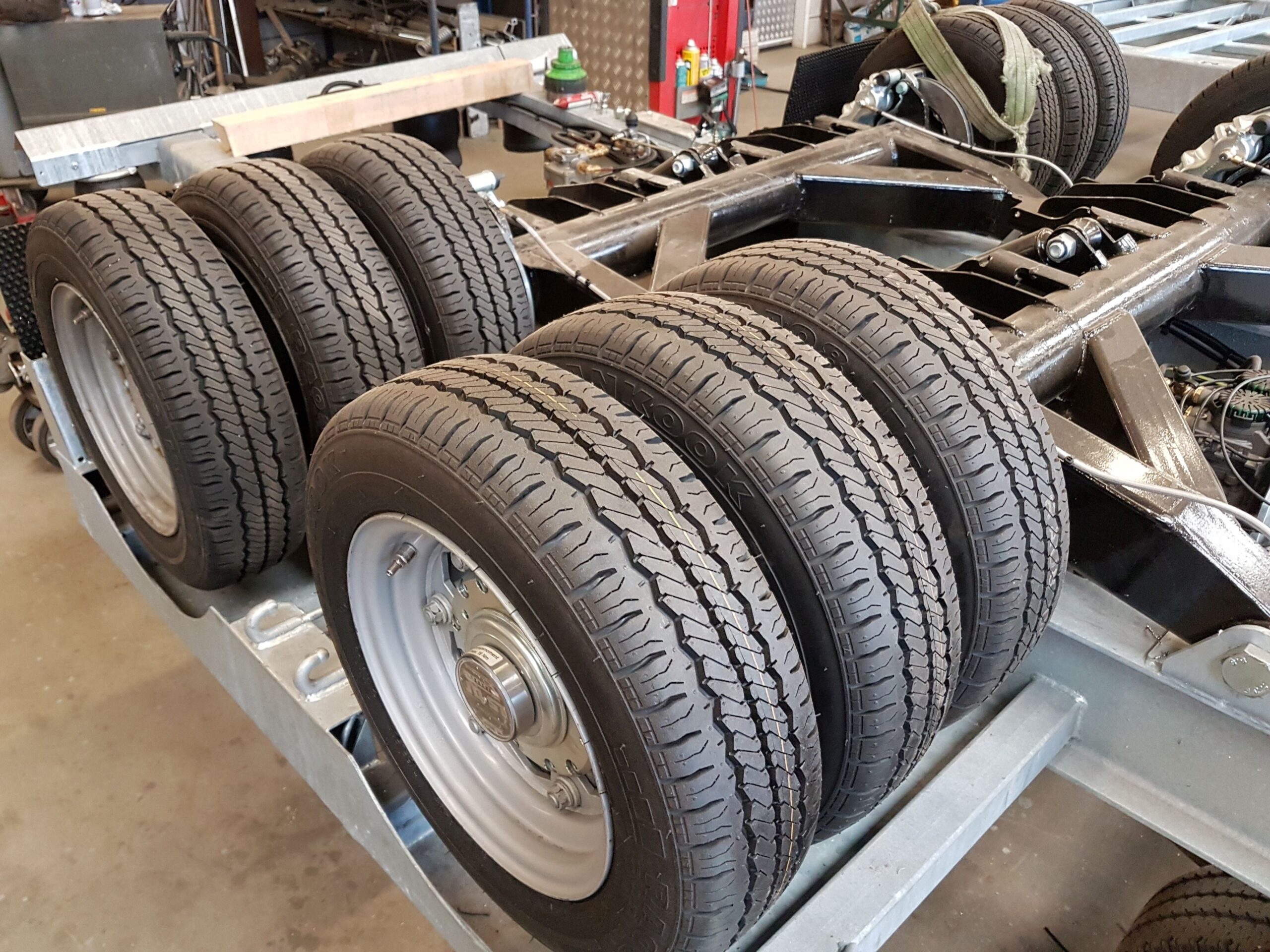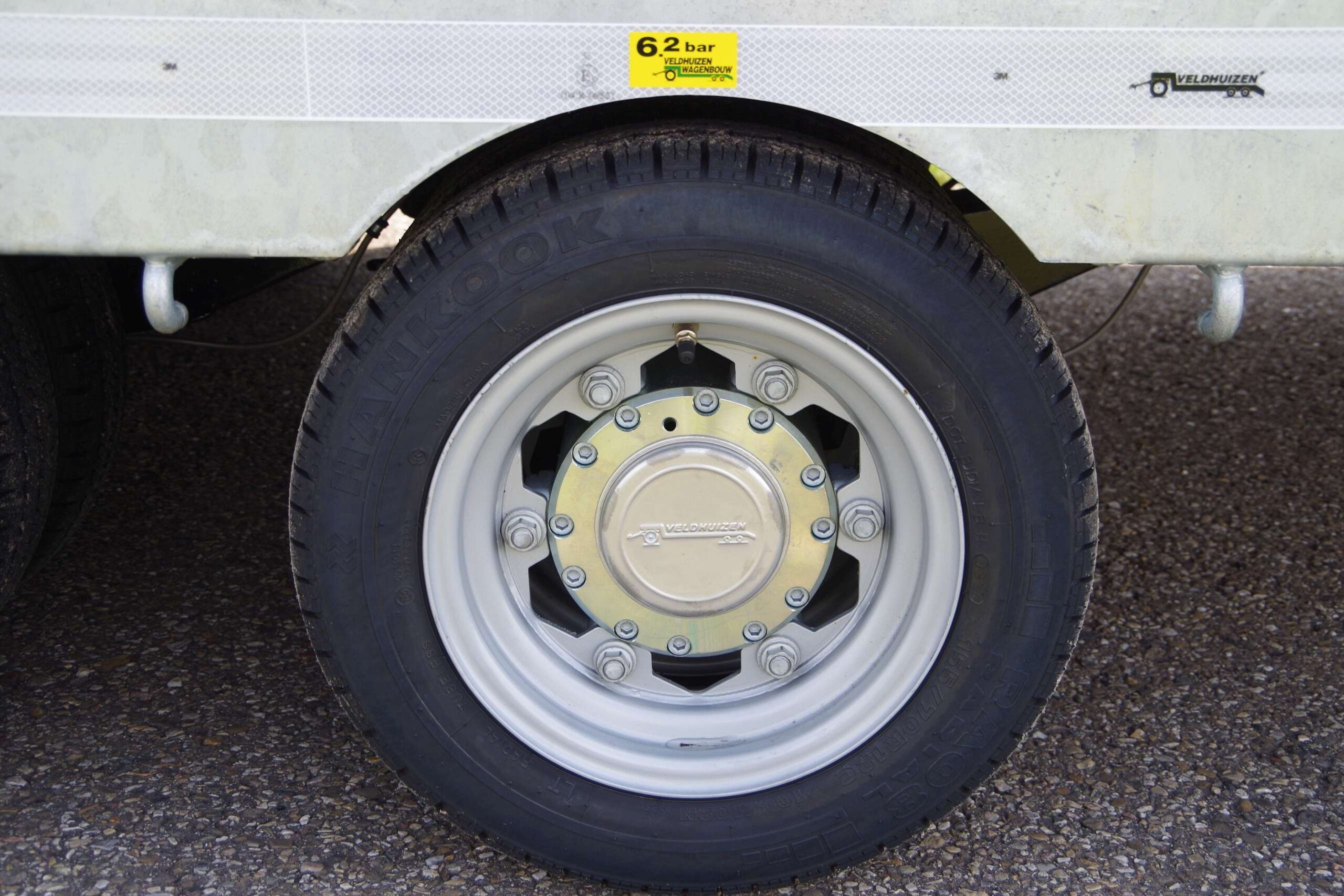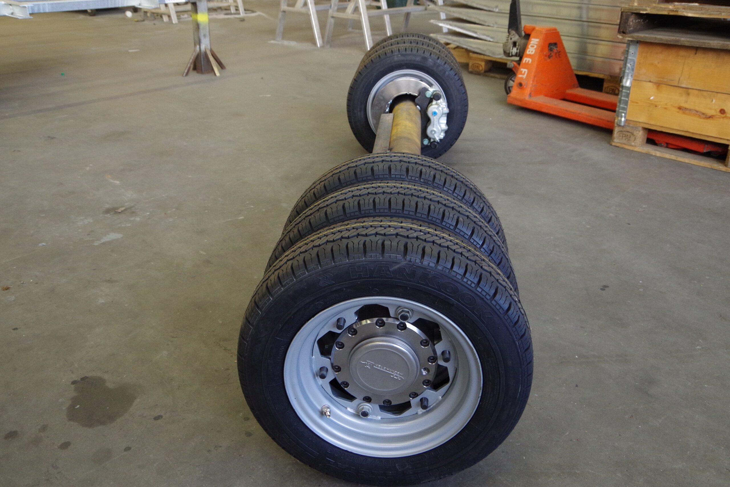 Veldhuizen denkt het antwoord te hebben gevonden door een nieuwe as te ontwikkelen met driedubbele montage. ,,De as is voorzien van 155/70R12 banden, een band die succesvol wordt toegepast bij zware auto- aanhangwagens en BE opleggers. Met speciaal daarvoor ontwikkelde velgen was al dubbele montage mogelijk met deze banden waardoor het laadvermogen 3,5 ton per as wordt. Voor veel toepassingen bleek dat echter onvoldoende, reden voor Veldhuizen om door te ontwikkelen.’’