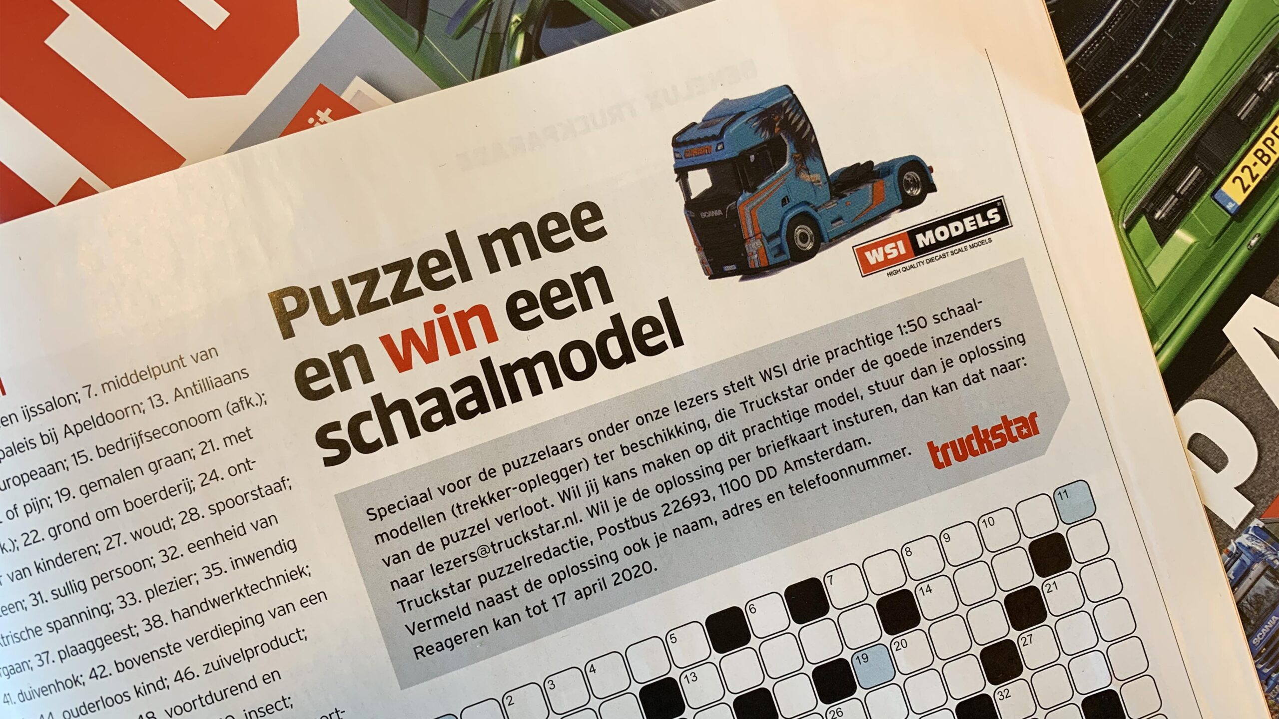 Onder de goede inzendingen verloten wij 3 schaalmodellen van WSI. Wil jij kans maken op dit prachtige schaalmodel, stuur dan je oplossing naar lezers@truckstar.nl. Wil je de oplossing per briefkaart insturen, dan kan dat naar: Truckstar puzzelredactie, Postbus 22693, 1100 DD Amsterdam. Vermeld naast de oplossing ook je naam, adres en telefoonnummer.