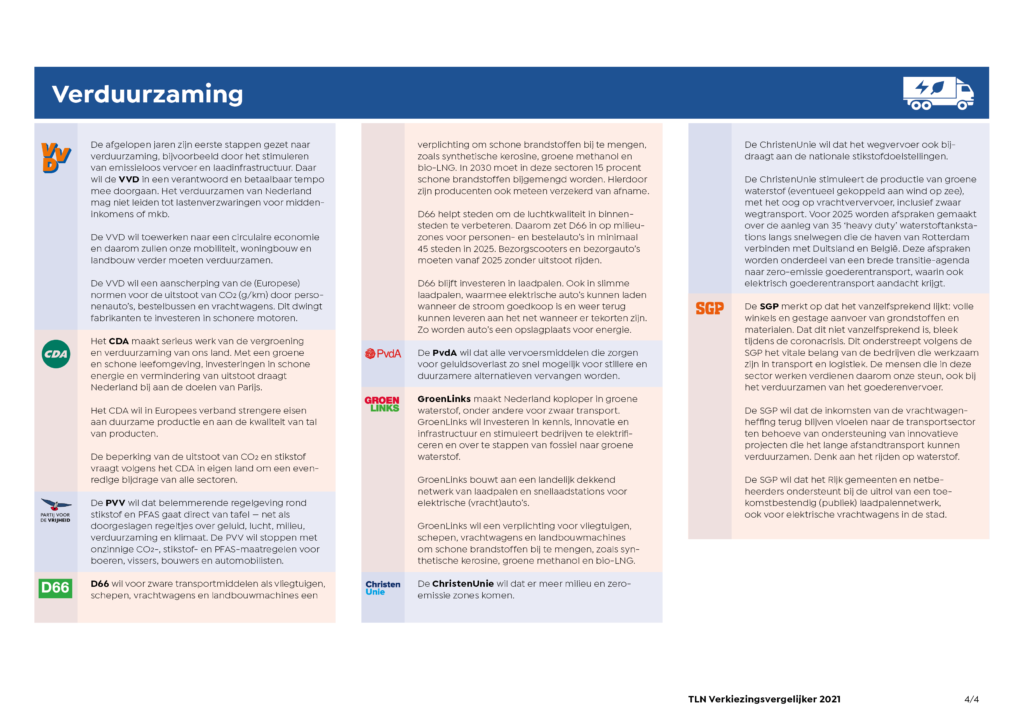 In dit overzicht vind je de standpunten van politieke partijen over relevante thema’s voor de sector transport en logistiek voor de Tweede Kamerverkiezingen 2021. Dit overzicht is door TLN gemaakt.