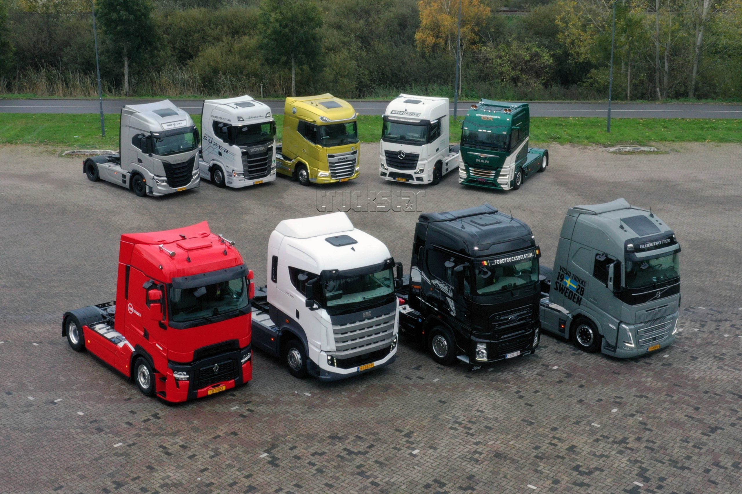 Het is een mooi gezicht, al die negen trucks op een rij. We hebben de fabrikanten om de grootste variant gevraagd en dat is te zien. Alle cabines zijn hoog, met uitzondering van de BMC, die duidelijk lager is. In de breedte ontlopen ze elkaar dan weer niet. Dat belooft veel goeds voor de leefruimte van de chauffeur, want dat is waar het in deze test om gaat. Hoe de trucks smoelen, laten we hier dus achterwege. Over smaak valt immers niet te twisten, zo luidt het gezegde.