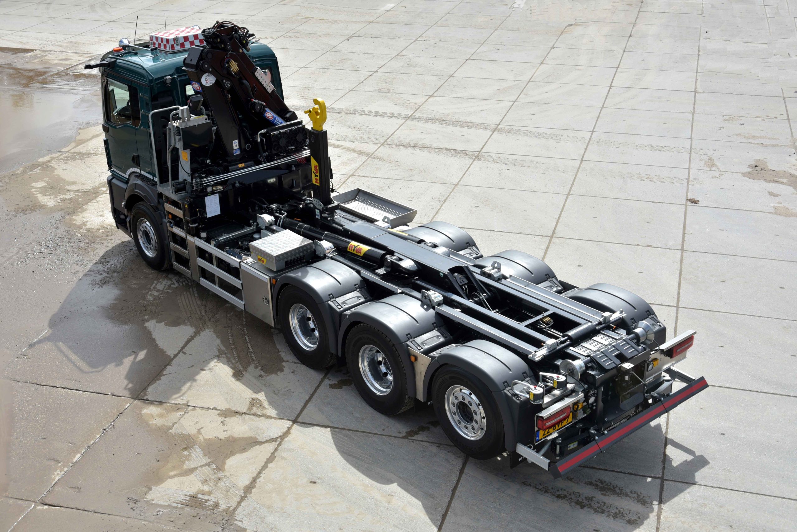 De nieuwe MAN TGS is uitgerust met een 21 tons Hyva haakarmsysteem en een HMF 19 ton/meter autolaadkraan. De truck werd compleet opgebouwd door Derx Davidson in Haarlem. Het MAN 8×4-4 chassis werd af fabriek geleverd, waarna WVT de vooras aan heeft gepast naar een draagvermogen van 10 ton.