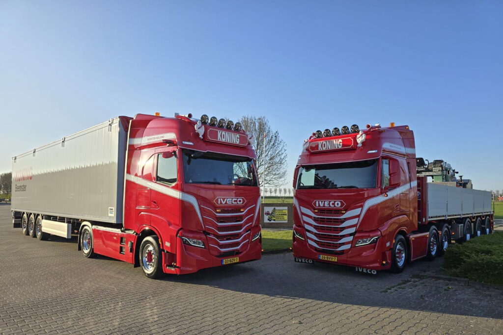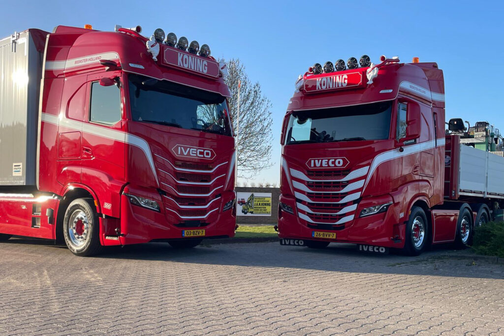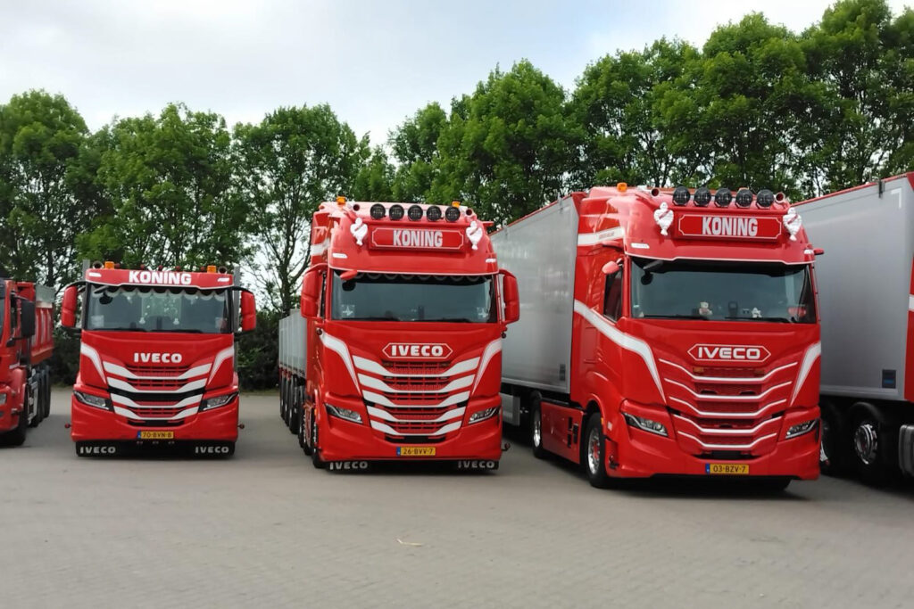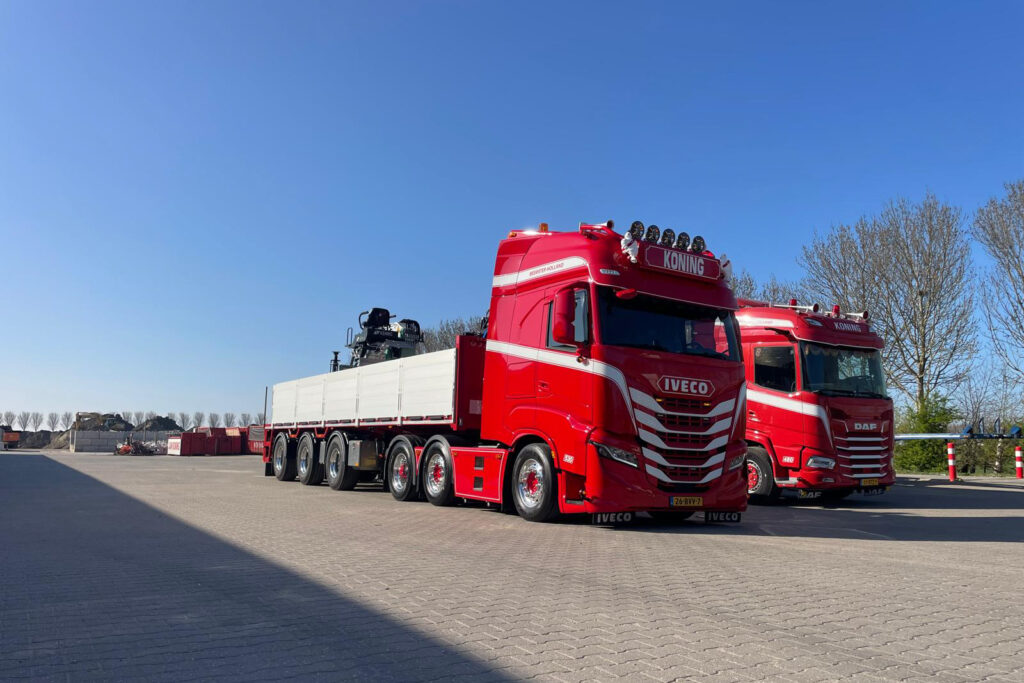 Voor het zware transport maakt Koning & Zn gebruik van Iveco-trucks met vermogens van 500 tot 530 pk. Deze voertuigen worden vooral ingezet voor het vervoer van losgestorte materialen, zoals stenen en rijplaten, met vaste chauffeurs op iedere truck. “We kiezen voor Iveco vanwege het vertrouwen in het merk én de leverancier. Het zijn fijne voertuigen met een hoog gebruikersgemak en we worden goed geholpen door onze dealer,” aldus de eigenaar.