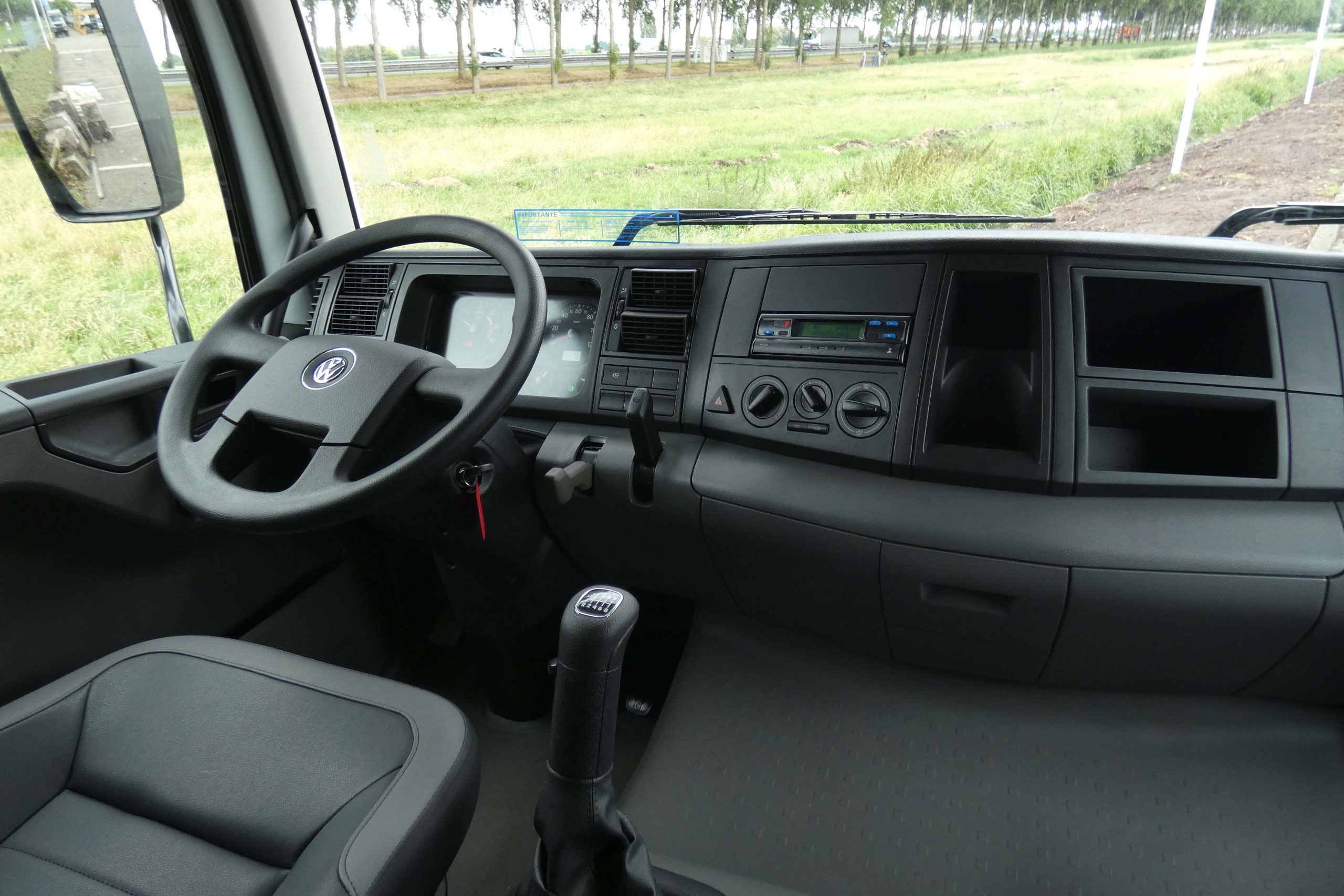 De cabines ogen mooi strak en modern. Ze zijn echt voor deze Volkswagens ontwikkeld. Hier geen camera’s, maar gewoon achteruitkijkspiegels op robuuste beugels. Het grootste verschil met moderne Europese trucks wordt zichtbaar als de deur open gaat. Harde plastics als portierbekleding en nog een echte slinger om het raam te openen. De stoelen zien er met hun leren bekleding goed uit en zitten prima. De rest van het interieur maakt een sobere, maar robuuste indruk dankzij de vele kunststof. Het dashboard is simpel, met weinig knoppen en een analoog instrumentenpaneel. Wat er niet op zit, kan immers ook niet kapot. De slaapcabine heeft één bed en dankzij het hoge dak is er staruimte en boven het voorraam zitten grote kasten. Die simpele uitstraling heeft ook wel zijn charme. Schakelen gebeurt nog met de hand. Dit is nog een echte vrachtwagen, waarin je moet werken en niet door allerlei systemen wordt ‘geholpen’. Gewoon lekker basic.
