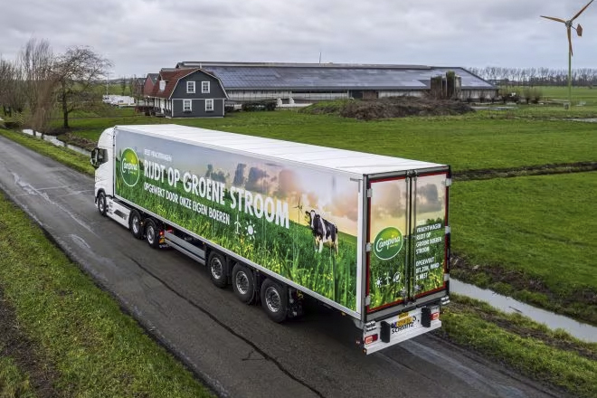 Sinds eind december draait de nieuwste Campina-vrachtwagen – die rijdt op groene stroom opgewekt door Campina-boeren – mee in de planning. Logistiek dienstverlener Simon Loos zorgde voor de ontwikkeling en uitvoering van dit initiatief.