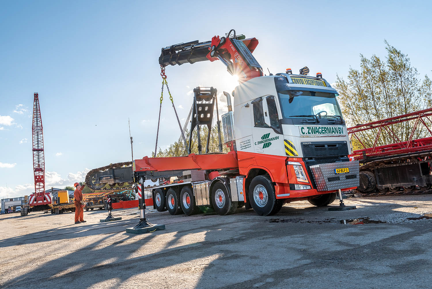 De recent geleverde Volvo FH 10×4 trekker met 165 tonmeter kraan is voorzien van een 13-liter motor met een vermogen van 540 pk. De 5-asser is uitgerust met luchtgeveerde dubbele voorassen en een luchtgeveerd tridem-stel met gestuurde, liftbare naloopas. Het maximaal wettelijke GVW bedraagt 45 ton; technisch is het 51 ton. Hij rolt af fabriek als 10×4 5-asser van de band. Dat vindt Zwagerman een groot voordeel omdat er geen aanpassingen aan het chassis uitgevoerd hoefden te worden voordat kraanspecialist De Jong uit IJmuiden aan de slag kon met de opbouw. “Dat scheelt tijd en geld. De 165 tonmeter autolaadkraan is de zwaarste opvouwbare kraan die wij voor deze inzet gebruiken”, zegt Zwagerman . “Het grote voordeel daarvan is dat we selfsupporting zijn en geen extra kraan nodig hebben. Voor ons is dat erg belangrijk omdat we in grote delen van Europa actief zijn in opdracht van internationaal opererende aannemers. Met deze configuratie kunnen we altijd zelfstandig werken.”