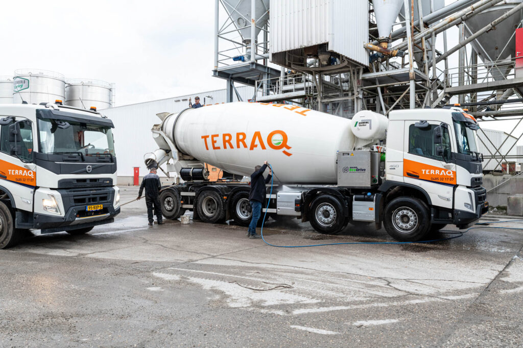 De 15-kuubs betonmixer wordt elektrisch aangedreven door een accupakket dat na iedere werkdag wordt opgeladen bij de vestiging van Terraq. Naast de nieuwe truck is ook een bestaande Volvo FMX 10×4 omgebouwd. Martijn Hendriks, bedrijfsleider bij Terraq: “De accu’s zijn tussen de cabine en de mixer geplaatst, waardoor de ombouw relatief eenvoudig kon worden uitgevoerd zonder aanpassingen aan het chassis. De elektrische mixers zijn geleverd door Boogert Service, met een elektrische aandrijving en accu’s van Mulder Europe. Het elektrisch laten draaien van de mixer zorgt niet alleen voor minder uitstoot, maar ook voor veel minder geluid. Bij het lossen staat de chauffeur een half uur achter de truck. Dat is nu een stuk prettiger, want je hoort niet meer continu het geluid van de motor die de trommel aandrijft. Het is bijna helemaal stil.”