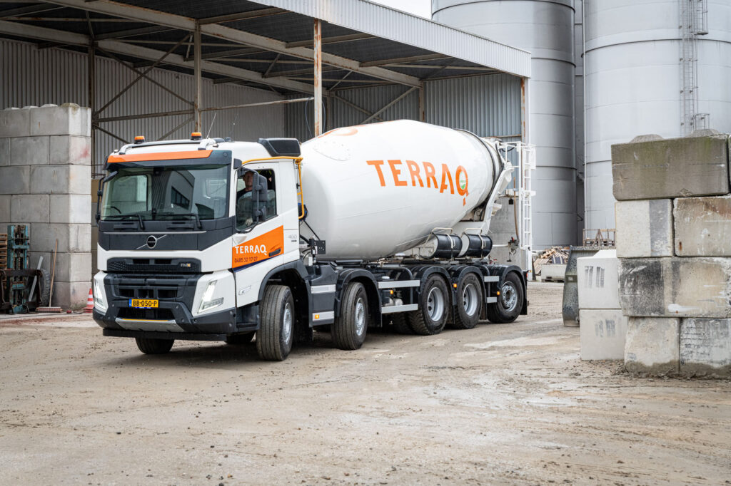 Terraq heeft een bijzondere nieuwe Volvo FMX 460 10×4-betonmixer in gebruik genomen. Deze truck rijdt op duurzame HVO100-brandstof en is uitgerust met een volledig elektrisch aangedreven betonmixer. Ook een bestaande Volvo FMX 10×4-betonmixer van Terraq is omgebouwd en voorzien van dezelfde elektrische aandrijving. De Volvo FMX 10×4 is geleverd door Volvo Trucks-dealer Nebim.